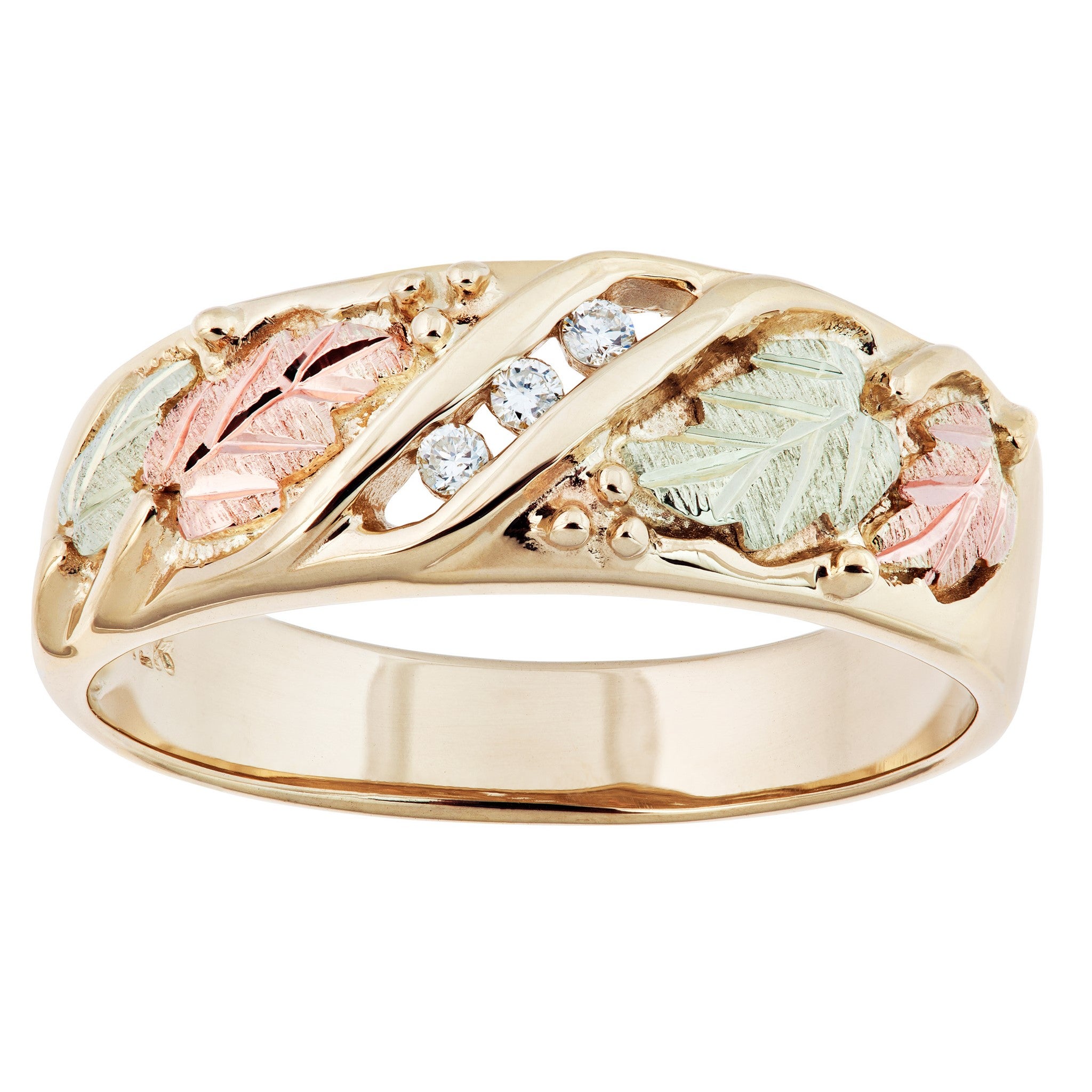 Black Hills Gold Men’s Wedding Band, 10kt Band with 3 Diagonal Diamonds .06TW Size accented with 12kt Rose and Green Gold Leaves. Size 10