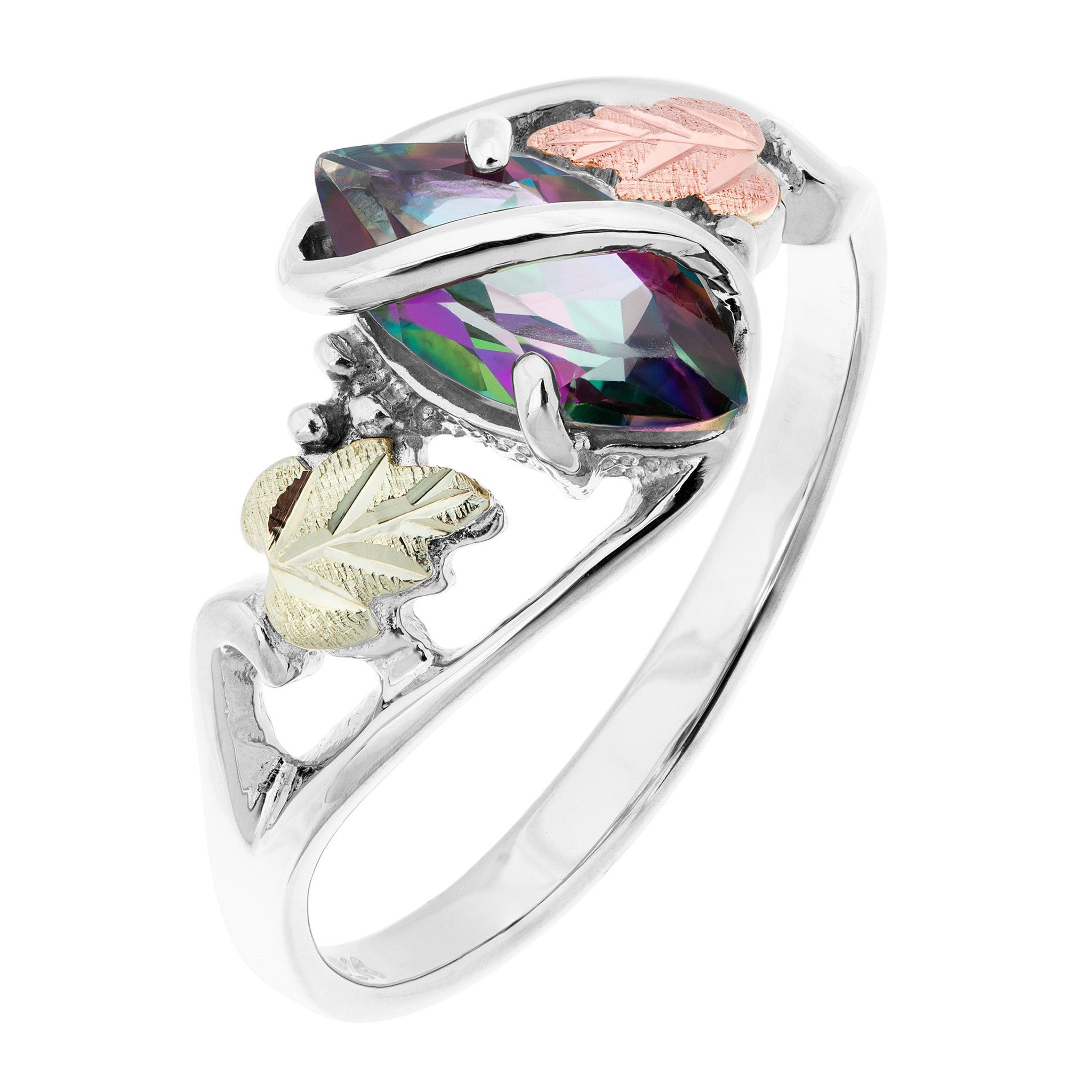 Black Hills Gold and Silver Ladies Mystic Fire Topaz ring, Sterling Silver band with a Marquise Mystic Fire topaz Stone with 12kt Rose and Green Gold leaves.