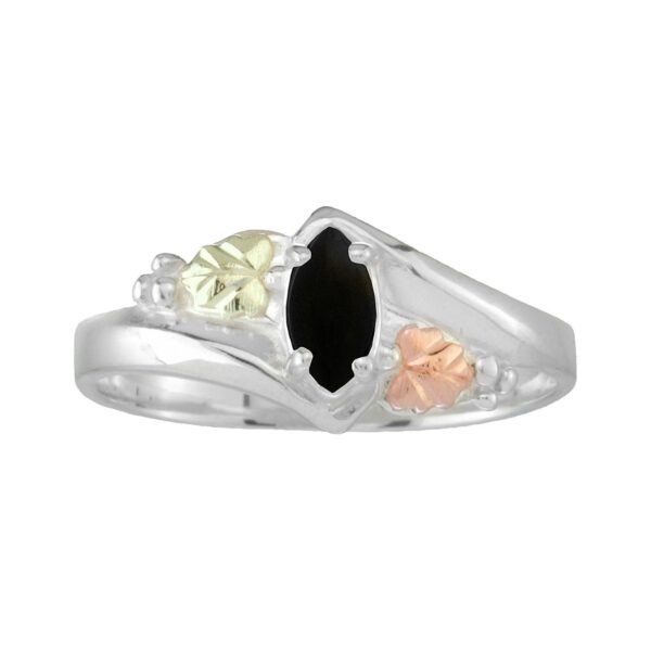 Black Hills Gold and Silver Ladies Onyx Ring, sterling silver band with a 6X3 Marquise Onyx stone and 12kt Rose and Green gold leaves.