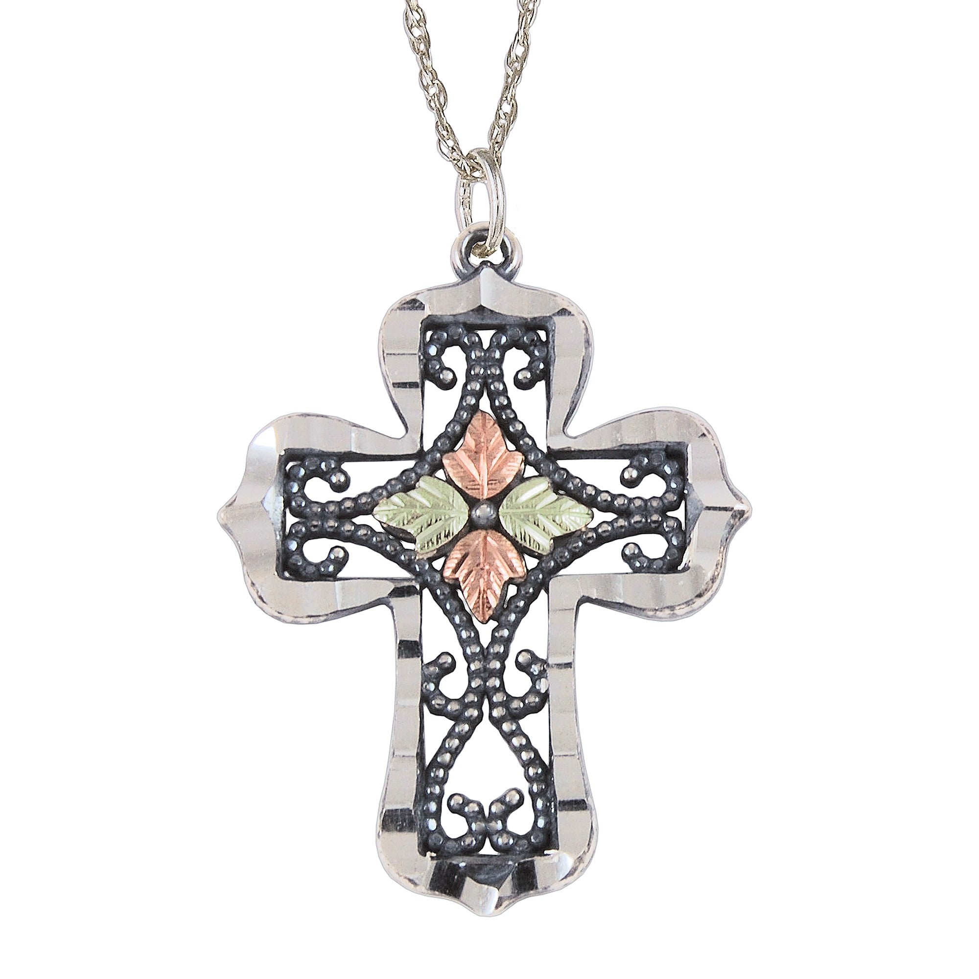 Black Hills Gold and Silver Cross Pendant, Sterling Silver Oxidized Open Cross with 12kt Rose and Green gold leaves. Includes a complimentary 18” chain.