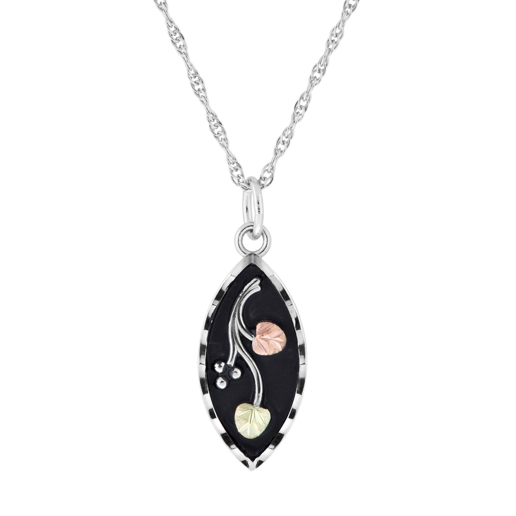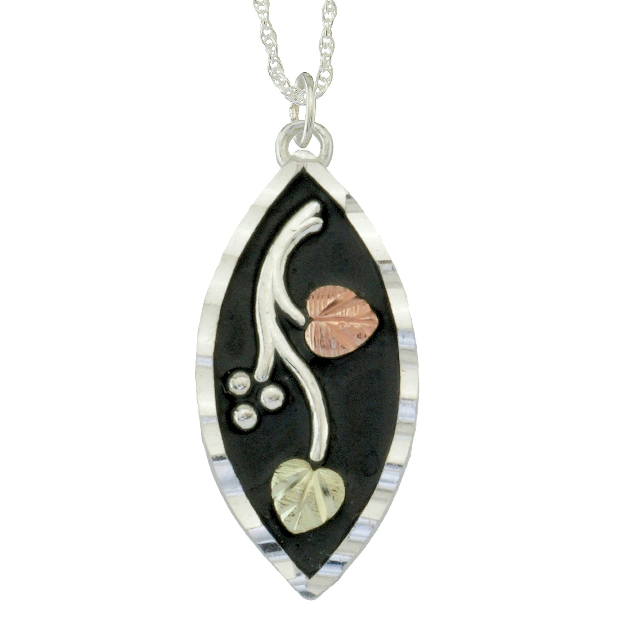 Black Hills Gold and Silver Antiqued marguise Pendant, Sterling silver pendant with grapevines and 12kt Rose and Green Gold leaves. Includes a complimentary 18” chain.
