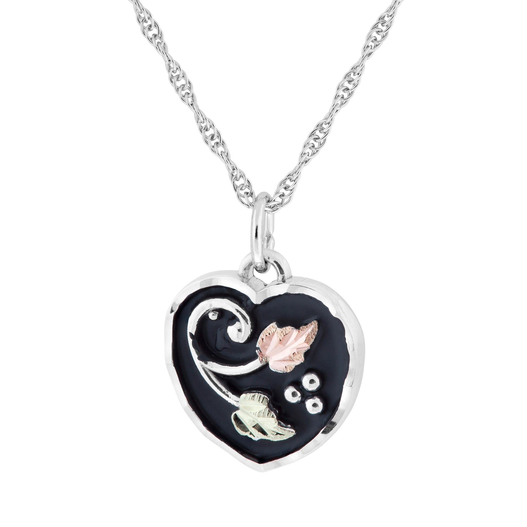 Black Hills Gold and Silver Heart Pendant, Sterling Silver heart with antiqued background holding 12kt Rose and Green gold leaves. Includes a complimentary 18” silver chain.