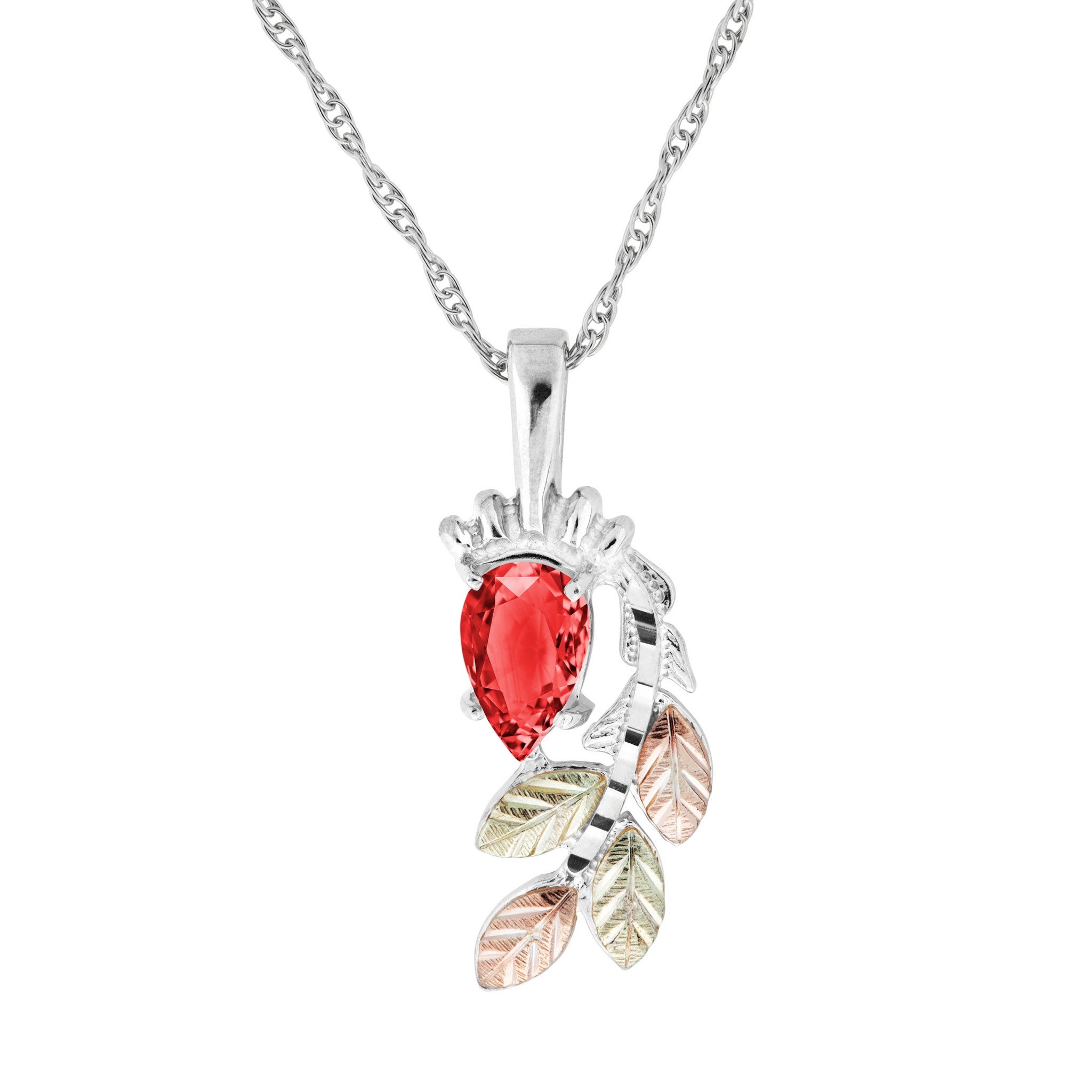 Black Hills Gold and silver Cascading Leaf Pendant, Sterling Silver Pendant with a Pear Shaped Garnet stone with 12kt Rose and Green Gold Leaves. Includes a complimentary 18″silver chain.