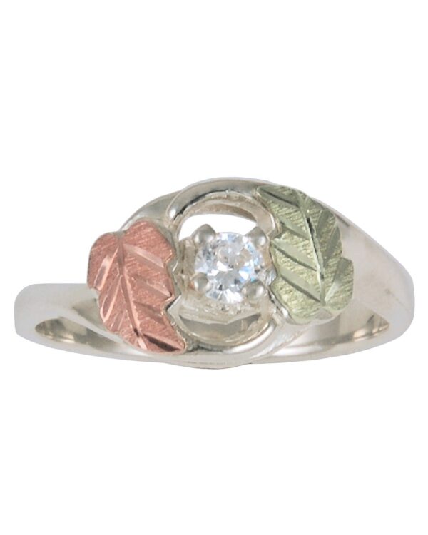 Black Hills Gold and Silver Ladies Engagement Ring, Sterling Silver band wrapped around a CZ stone with 12kt Rose and Green gold leaves