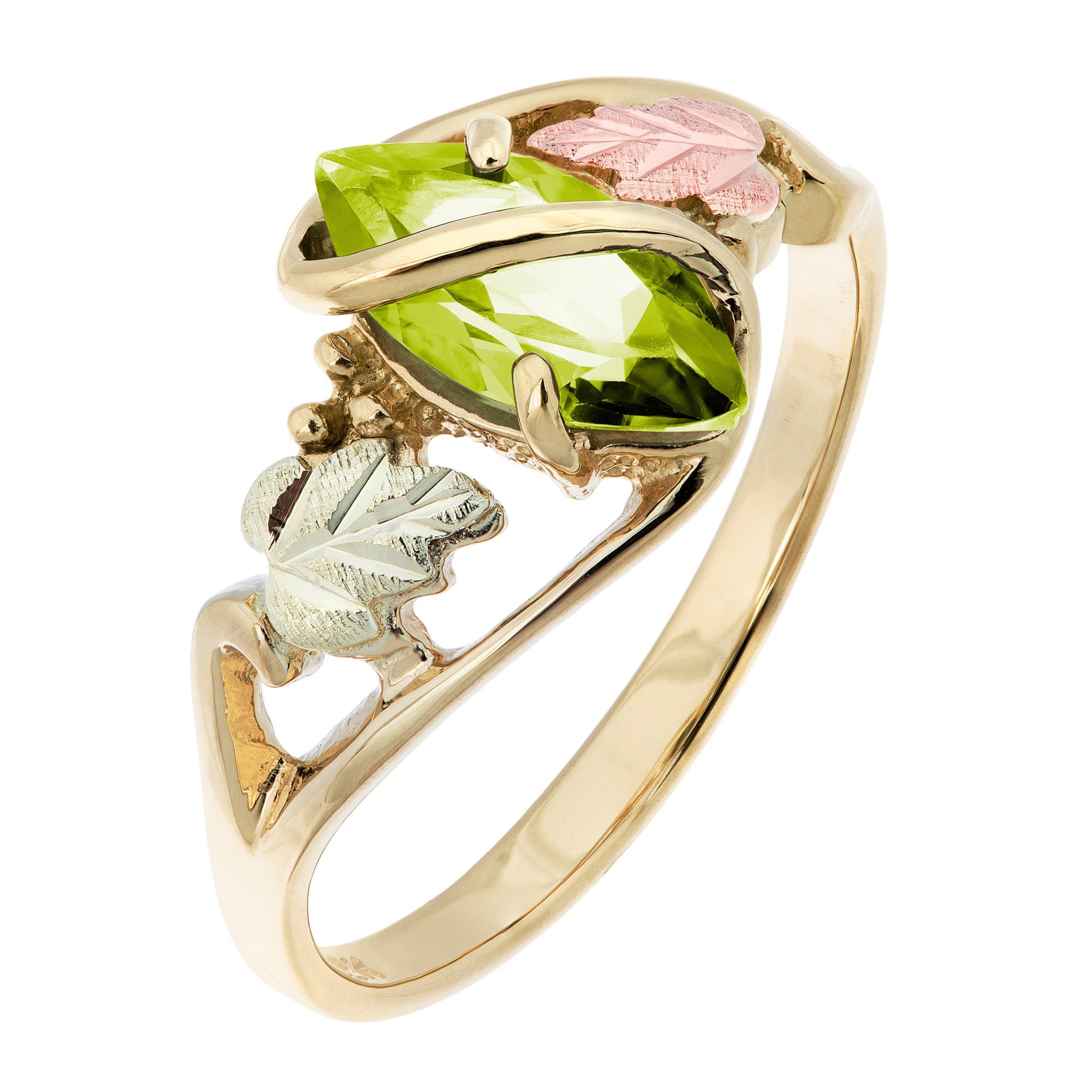 Black Hills Gold Ladies Peridot Ring, 10kt Gold band with 10X5 Marguise Peridot Stone and 12kt Rose and Green gold leaves. Size 9