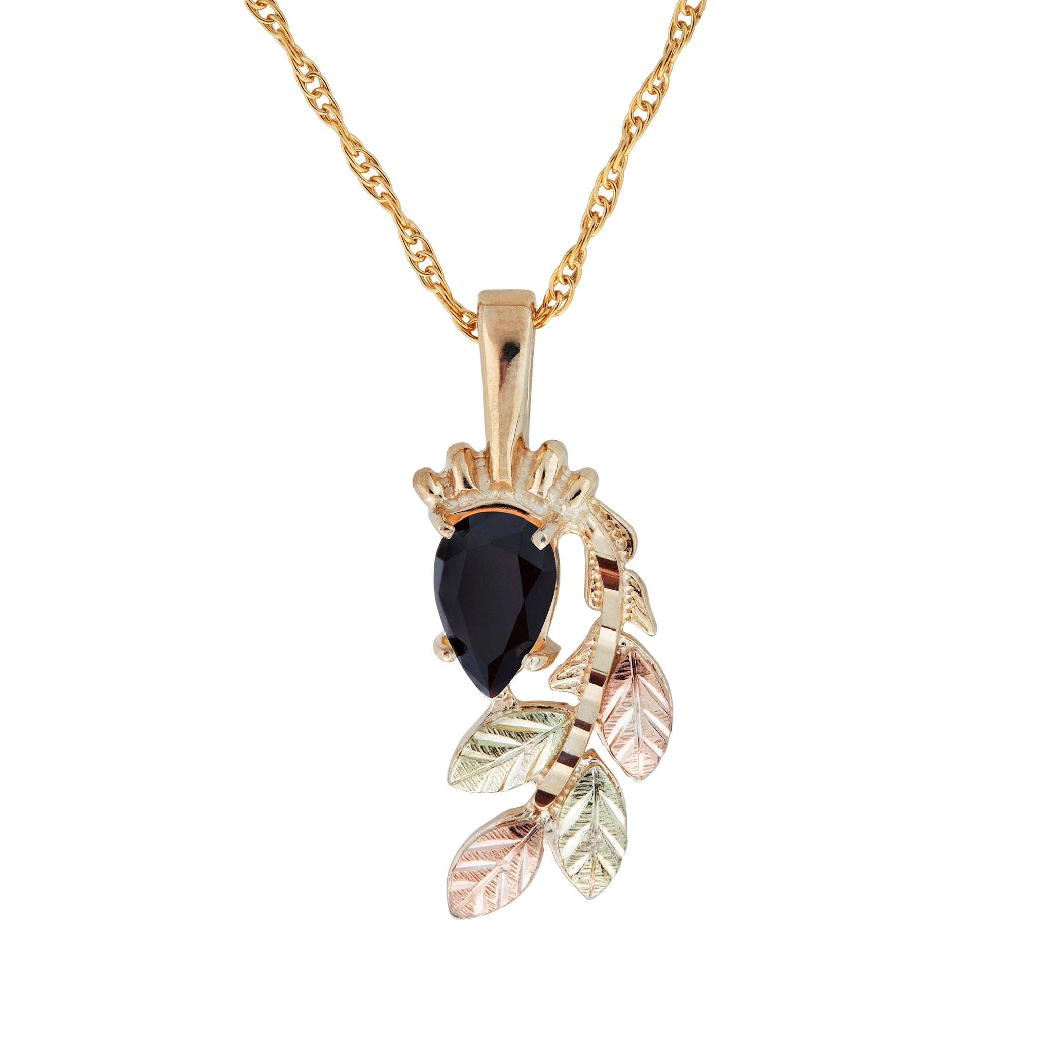 Black Hills Gold Cascading Leaf Pendant, 10kt Pendant with a Pear Shaped Onyx stone with 12kt Rose and Green Gold Leaves. Includes a complimentary 18″ golf filled chain.