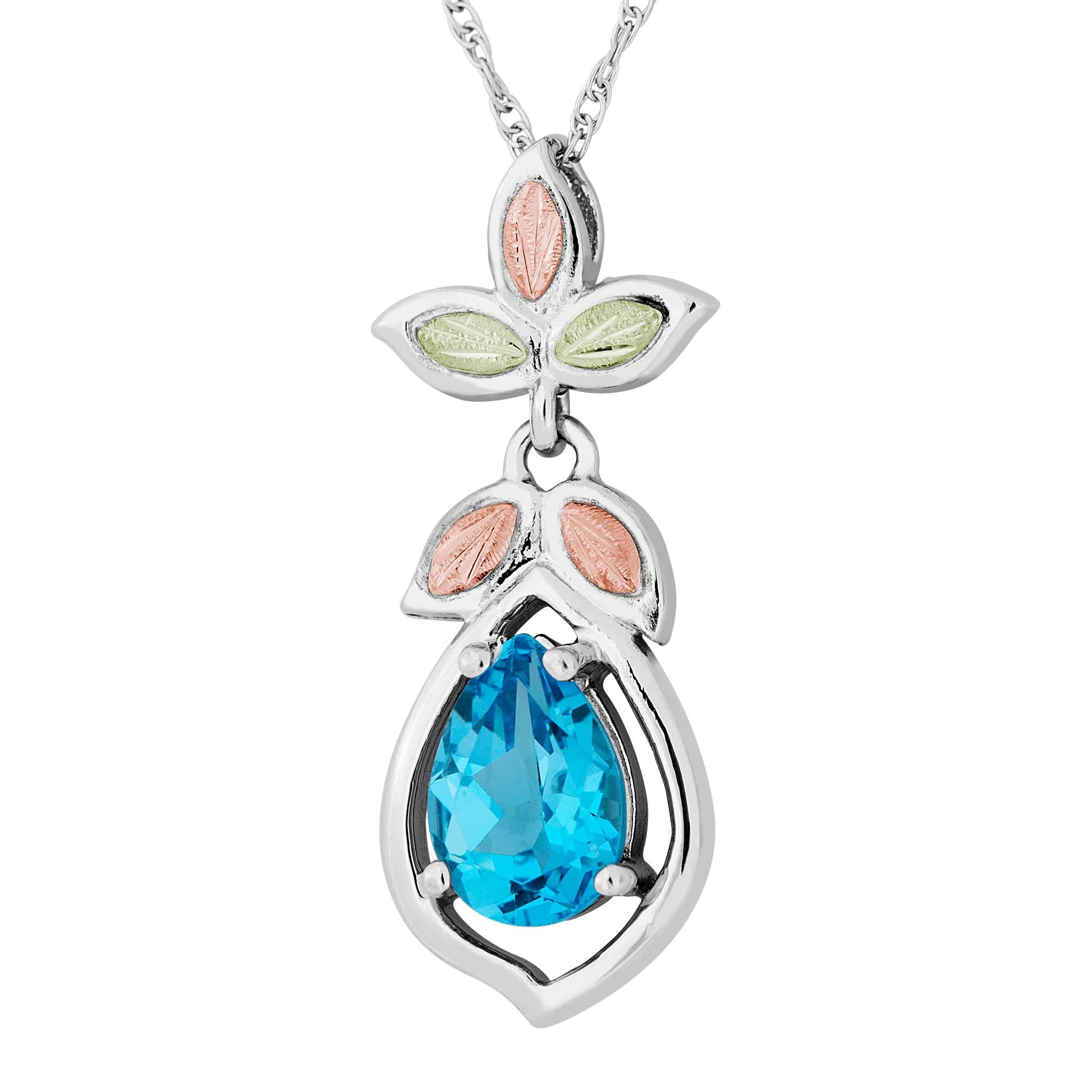 Black Hills Gold & Silver Ladies Swiss Blue Topaz Pendant; Silver Pendant accented with 12K Green & Rose Leaves and a 10x7MM Pear-shape Swiss Blue Topaz, on 18″ Silver Rhodium Chain