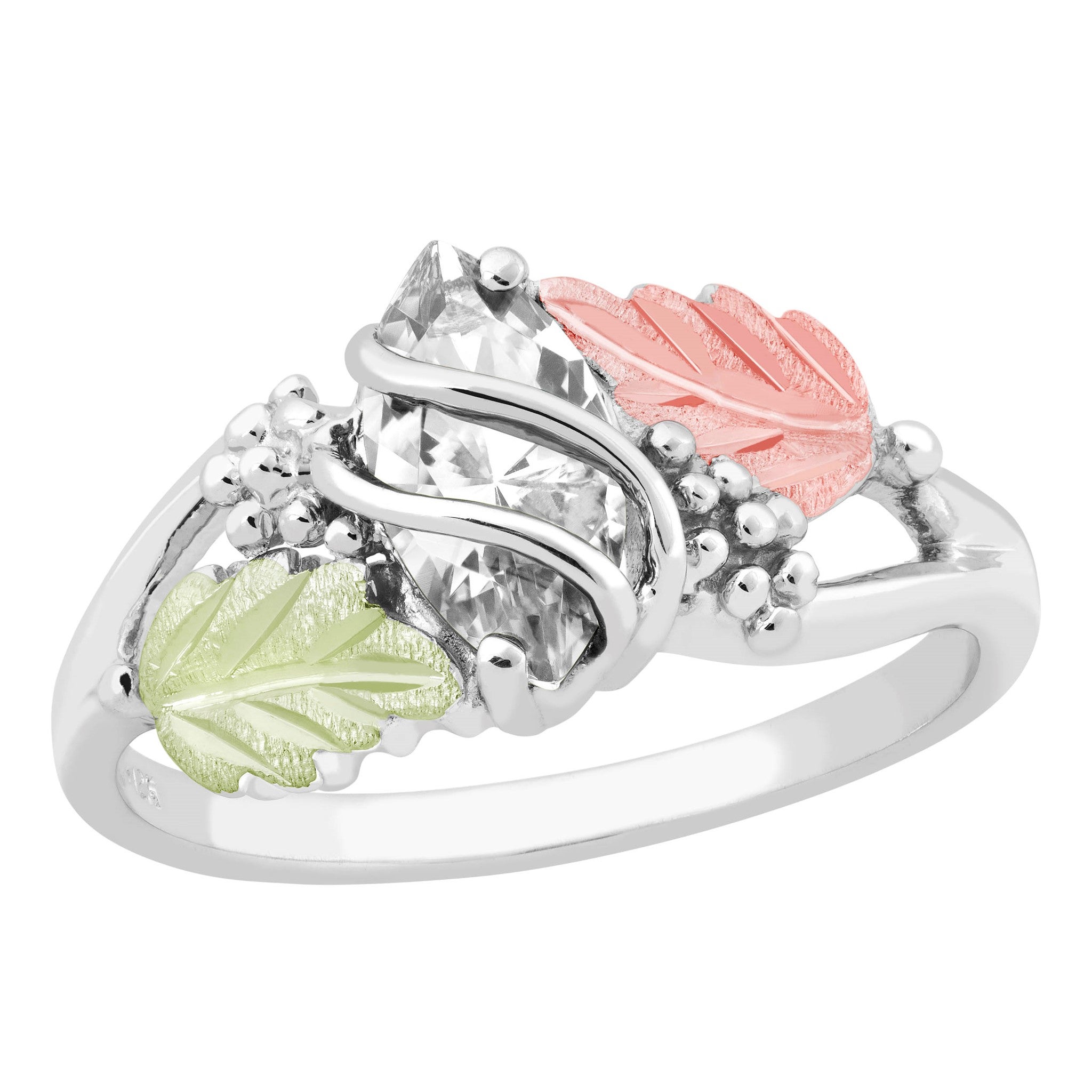 Black Hills Gold & Silver Ladies Birthstone Ring, Silver Ring with Grape Clusters, Caged 10x5MM Synthetic Marquise White Spinel (Apr) and (2) 12K Green and Rose Leaves