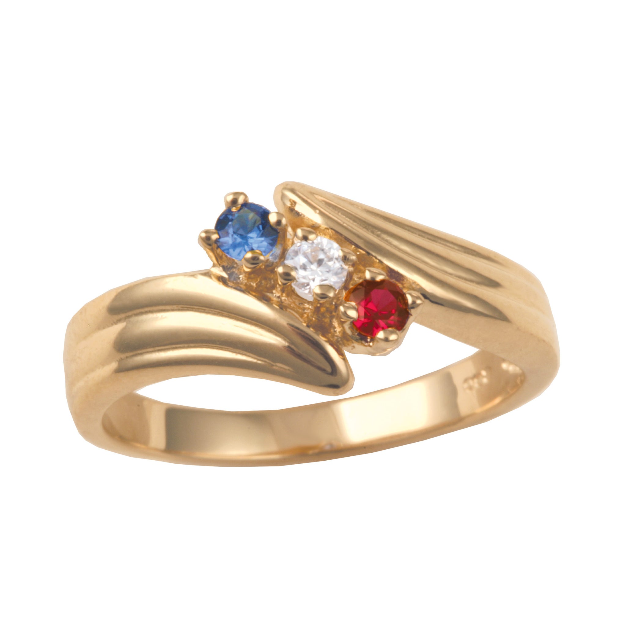 Fashion family ring in 10K yellow gold with genuine or synthetic stones. Shrimp bypass shank design can accommodate 1-5 2.5mm birthstones. Available in sizes 5-10 including 1/2 sizes at no additional charge. Available in genuine or synthetic birthstones. Please select the mounting option below for your desired number of stones and stone type for pricing and ordering.