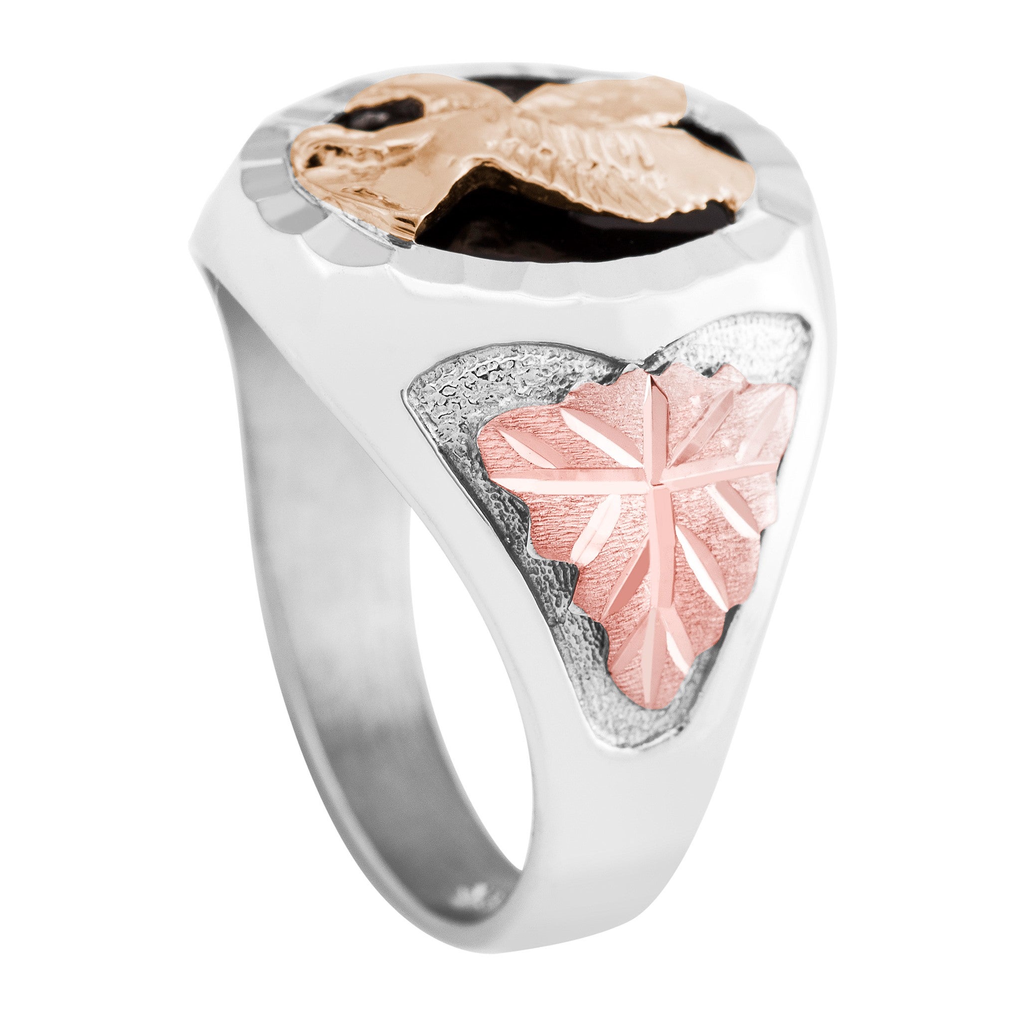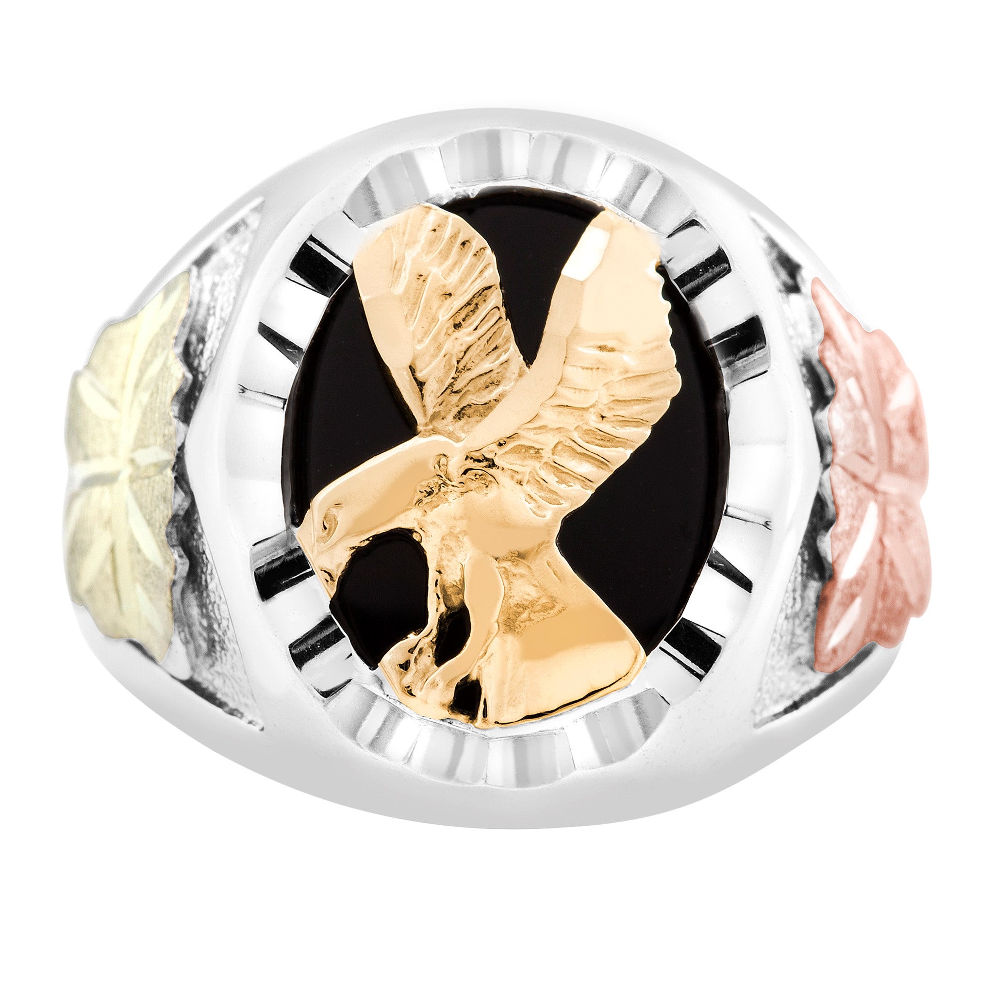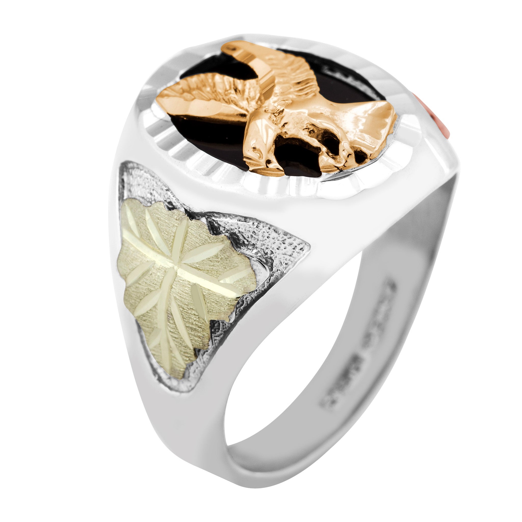 Black Hills Gold & Silver Mens Eagle & Onyx Ring, Silver Ring with 10K Eagle atop 16x12MM Oval Black Onyx inlay, and (2) 12K Green and Rose Leaves