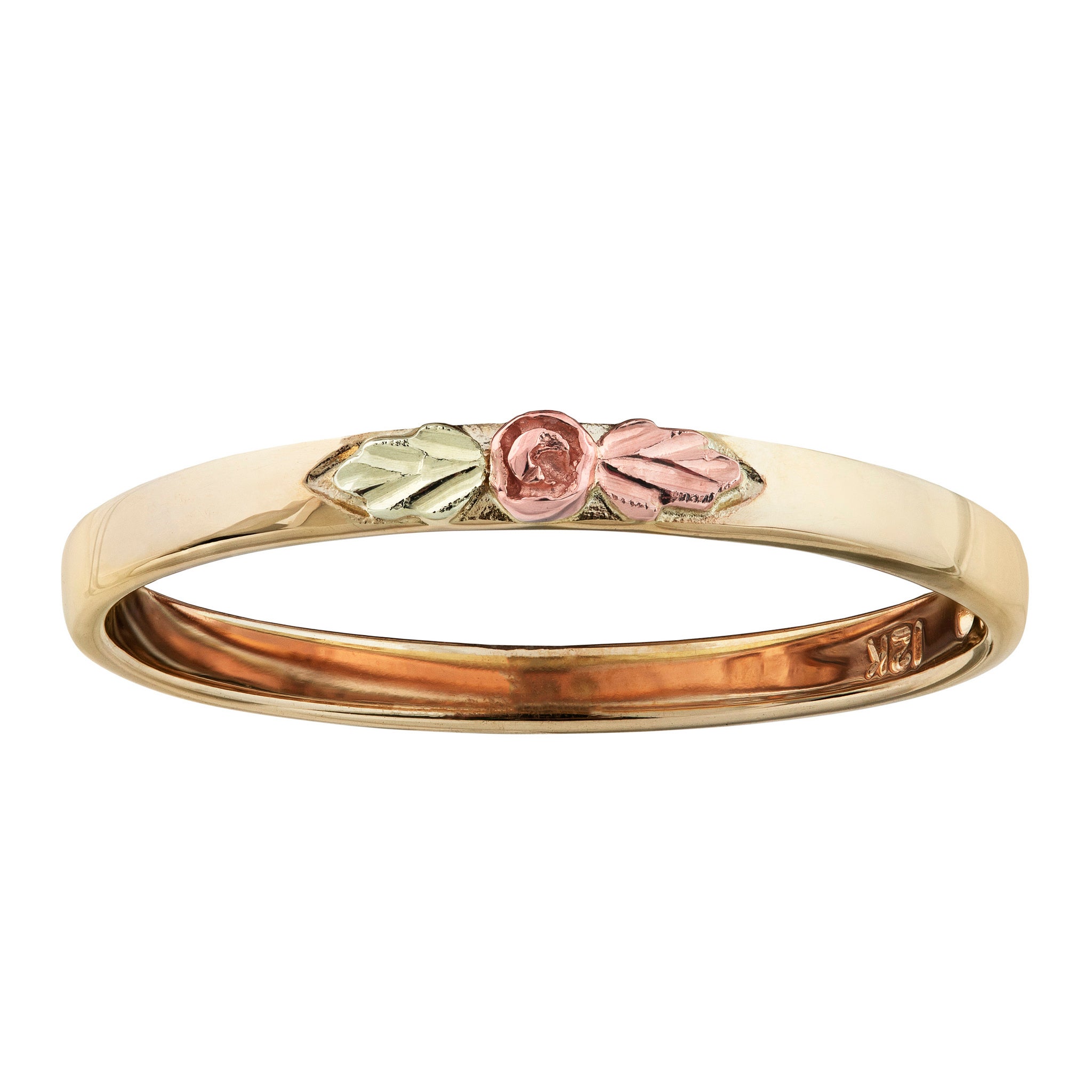 Black Hills Gold Ladies Stackable Ring, 10K Yellow Gold Shank with Center 10K Rose and 12K Green and Rose Leaves