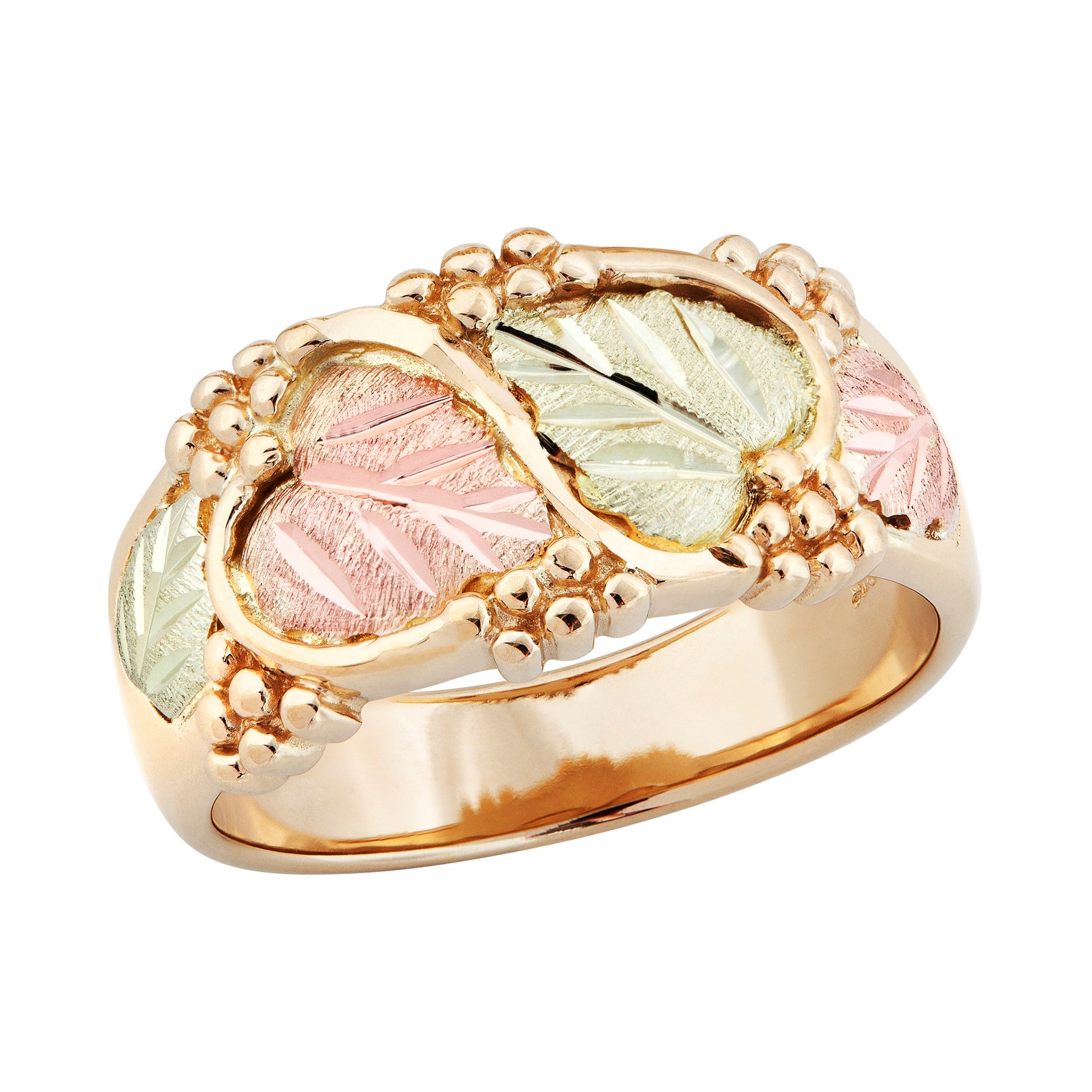 Black Hills Gold Ladies Wedding Band, 10K Shank with 12K Green and Rose Leaves on top of ring and each side, also 10K Grapes and Vines