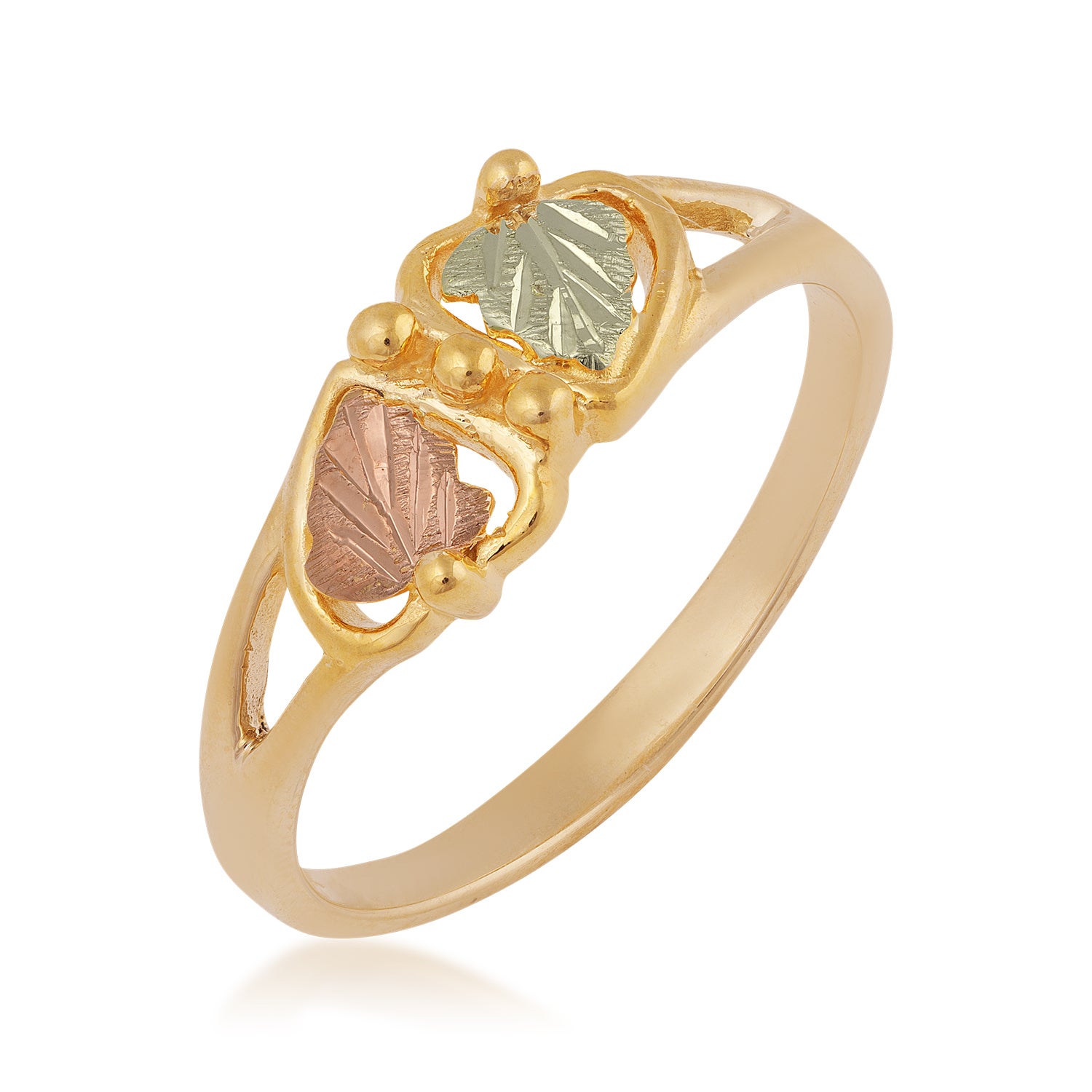 Black Hills Gold 12K yellow gold double hearts surrounded by vinework & grapes. The center of each heart is accented with 12K red & green gold leaves.