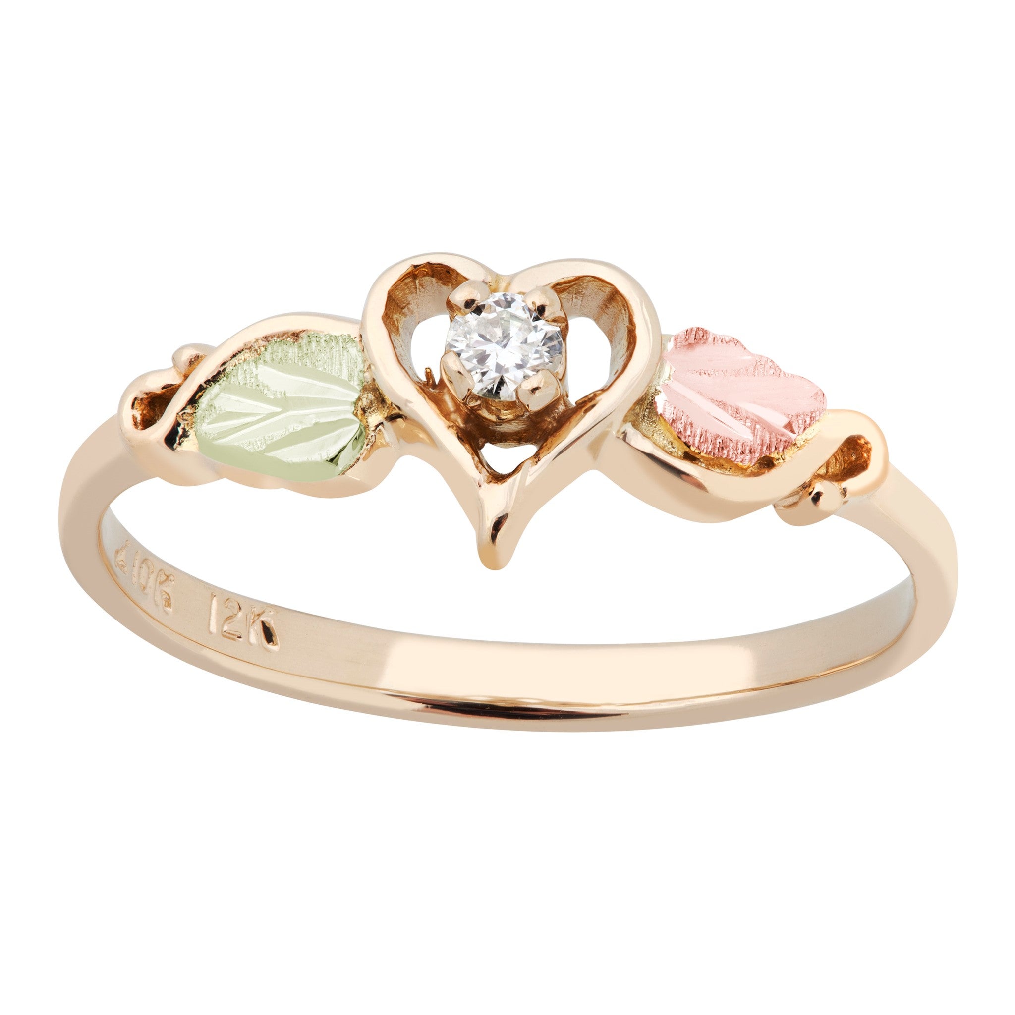 Black Hills Gold Original Ladie’s Heart Ring, 10Kt Gold Designed Band with a .05TWT Diamond Center, 12Kt Green and Rose Gold Leaves
