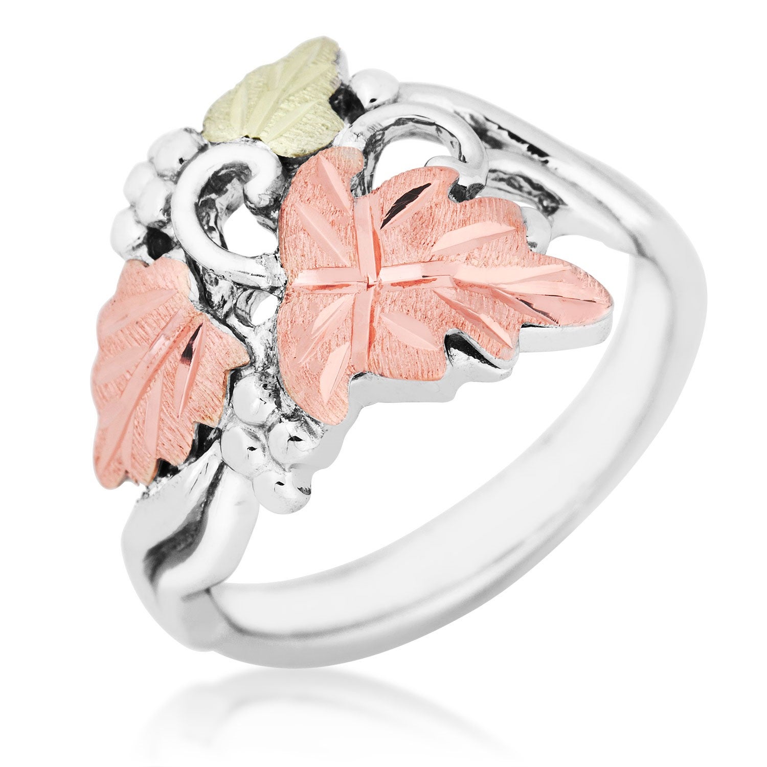 Black Hills Gold & Silver Ladies Freeform Ring, Silver Ring with Vines, Grape Clusters, and (3) 12K Green and Rose Leaves