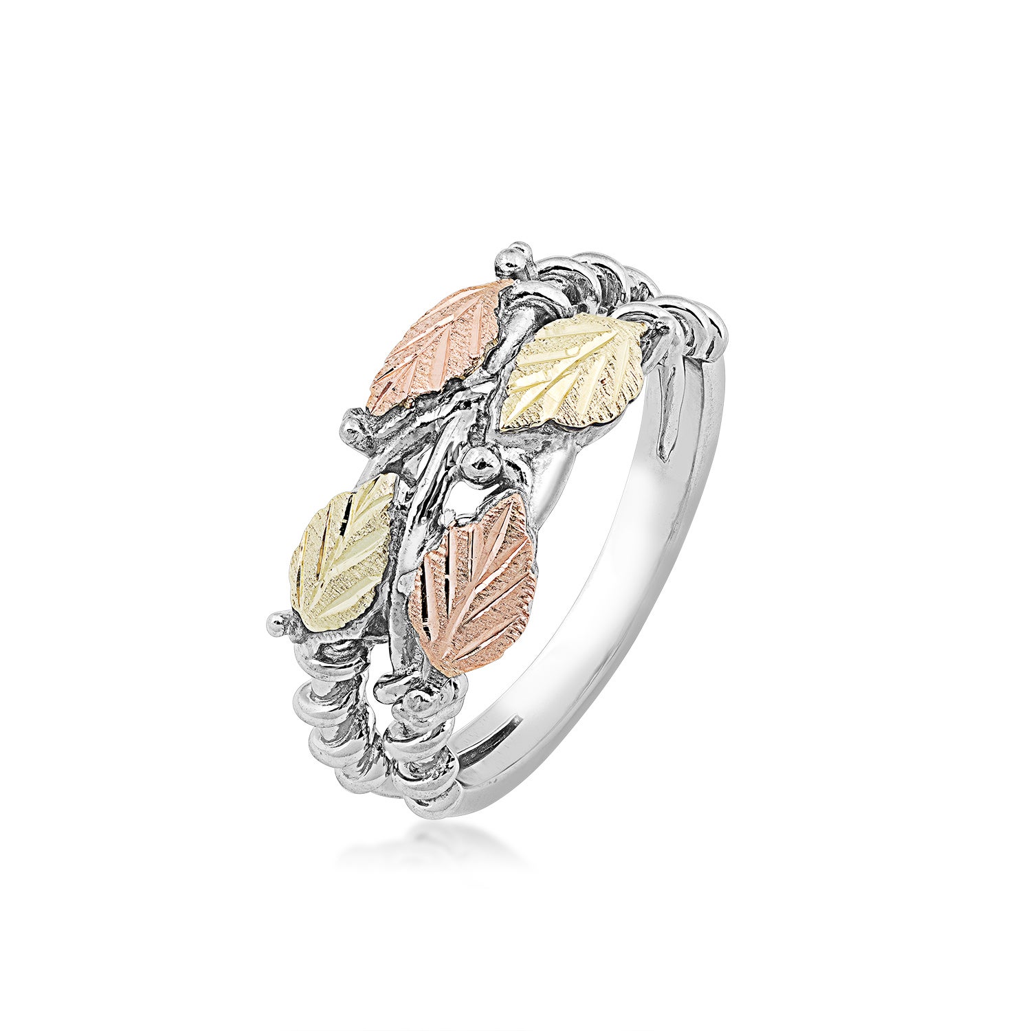 Black Hills Gold & Silver traditional band with organic vinework and grape clusters wrapped and accented with 12K rose & gold green leaves.