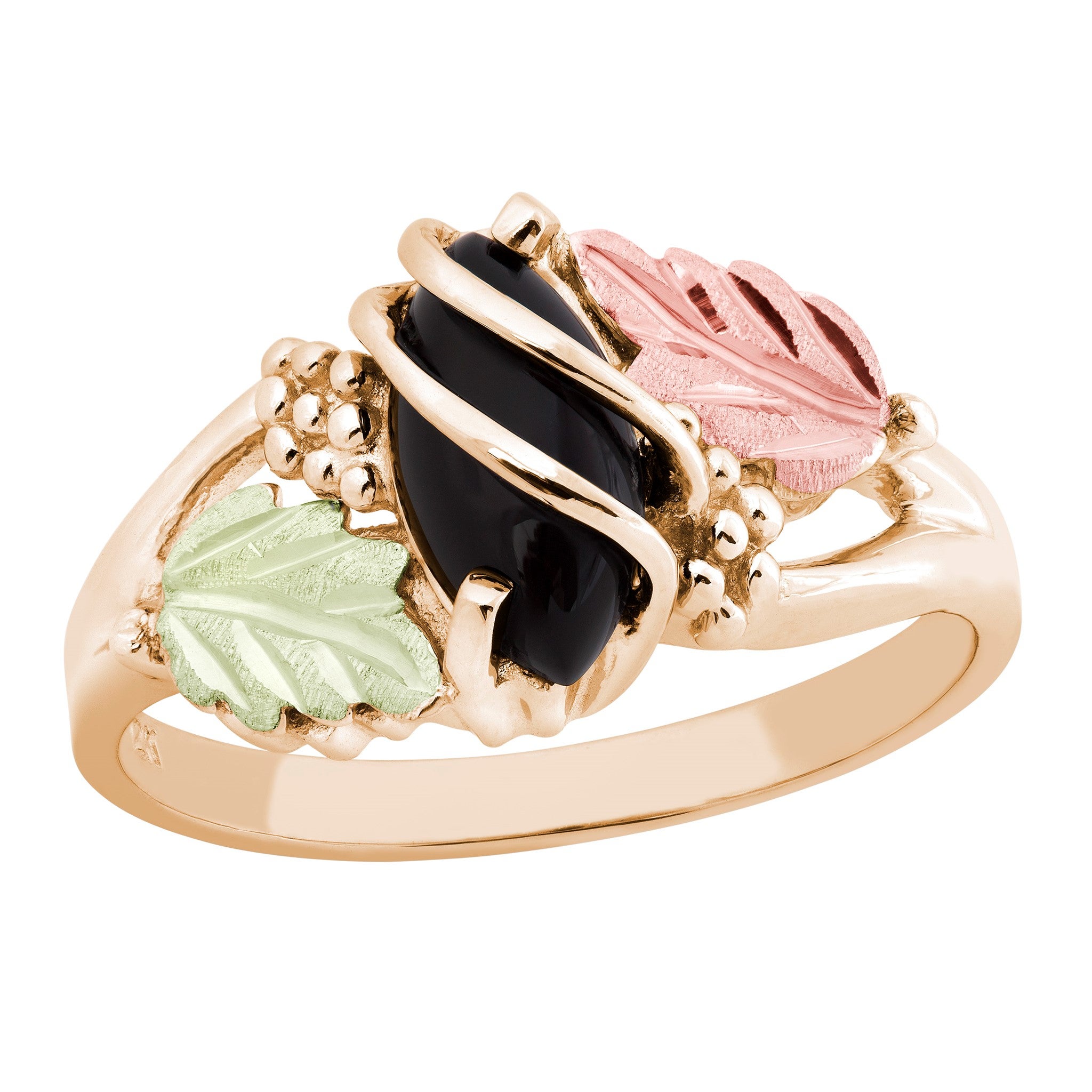 Black Hills Gold Ladies Onyx Ring, 10K Split Shank accented with caged 10x5mm Marquise Cabachon Black Onyx, Grape Clusters and (2) 12K Green and Rose Leaves