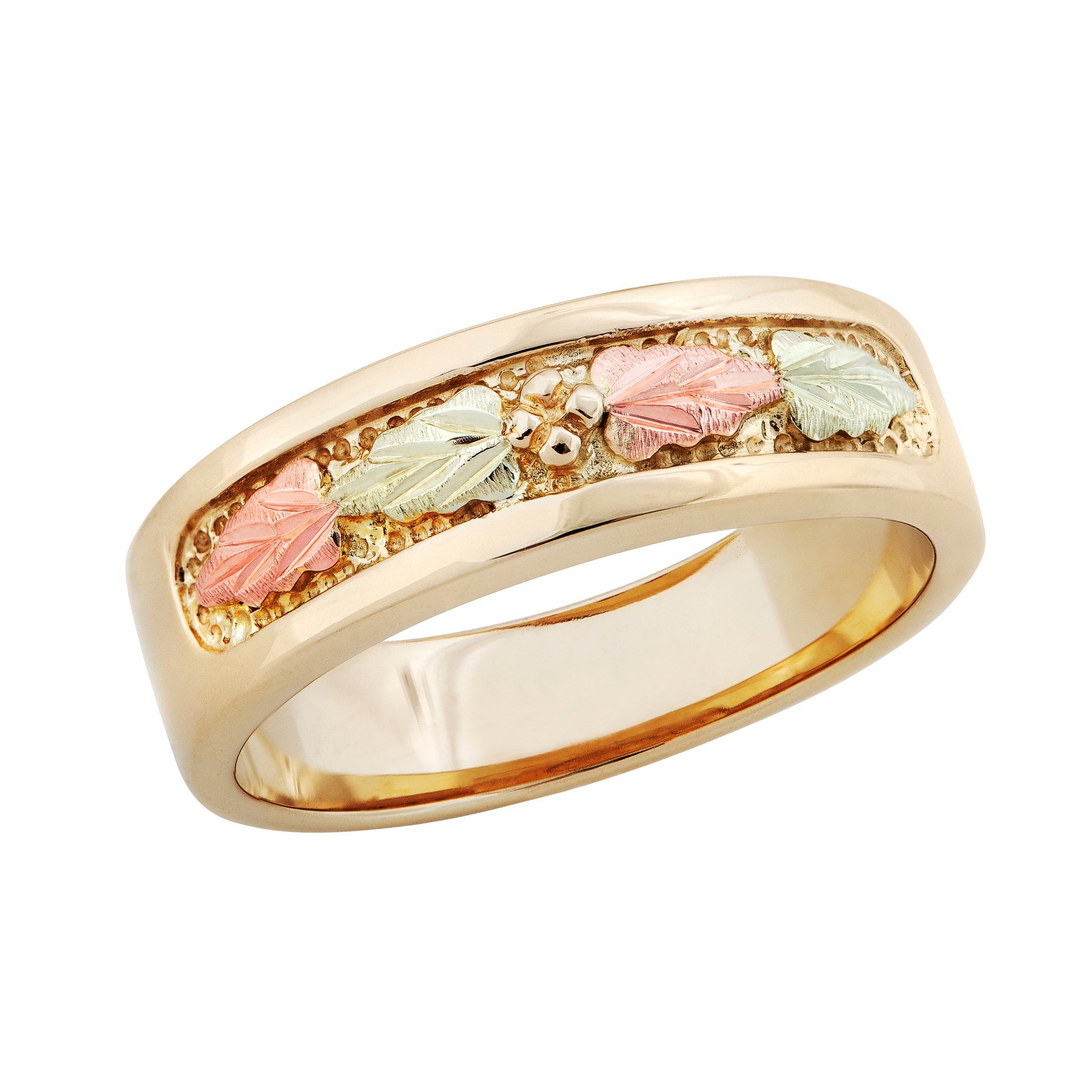 Black Hills Gold Ladies Wedding Band, 10K Straight Shank with recessed center containing a Grape Cluster and (4) 12K Green and Rose Leaves