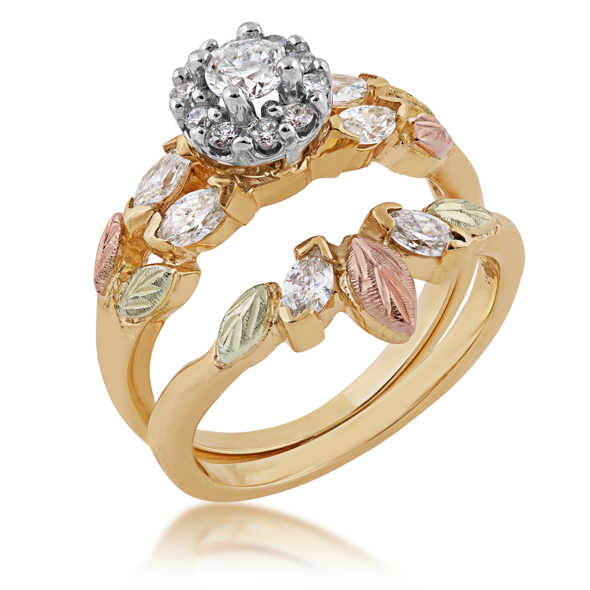 Black Hills Gold 1/5TW Diamond Wedding Ring accented with 12k pink & green leaves. Pair with G LWR942AD or G LWR943AD as a set or trio. Size 5.5