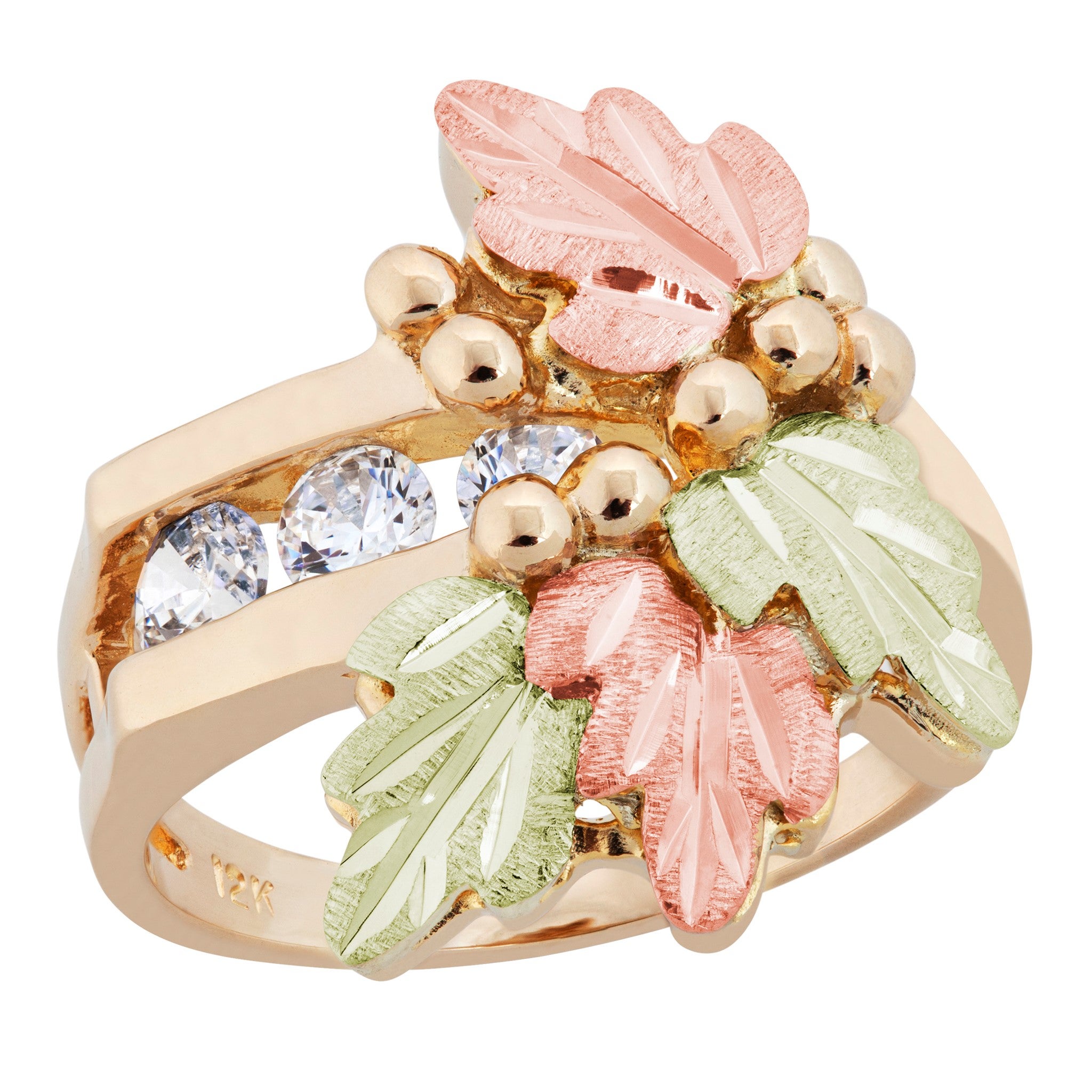 Black Hills Gold Ladies 3-Stone CZ Ring, 10K Split Shank with Grape Clusters and (3) Tension Set CZ’s (3MM – 3.5MM), and (4) 12K Green and Rose Leaves