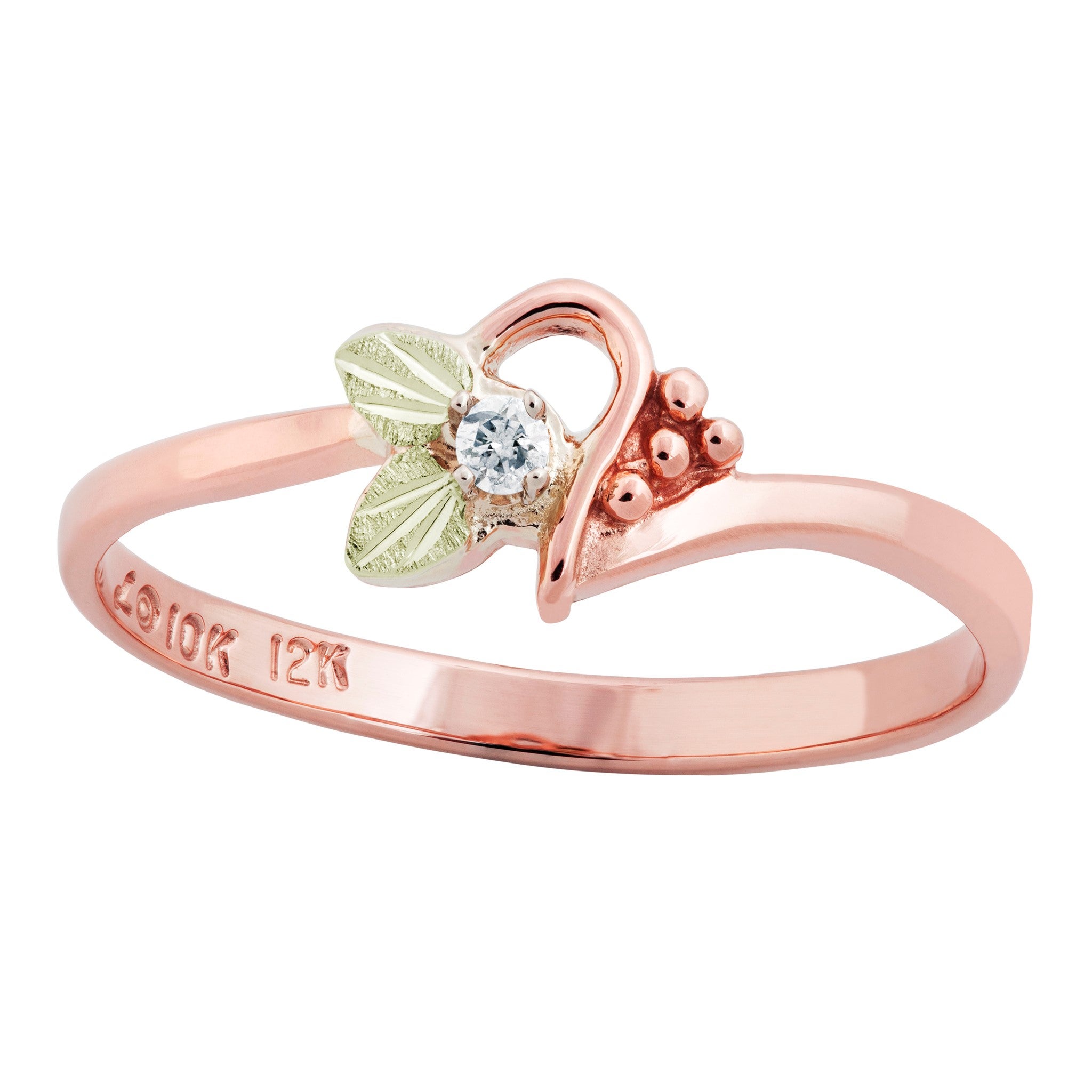 Black Hills Gold Ladies Diamond Ring, 10K Rose Gold Freeform Shank, Grape Cluster, accented with .02TCT Round Diamond framed by (2) 12K Green Leaves