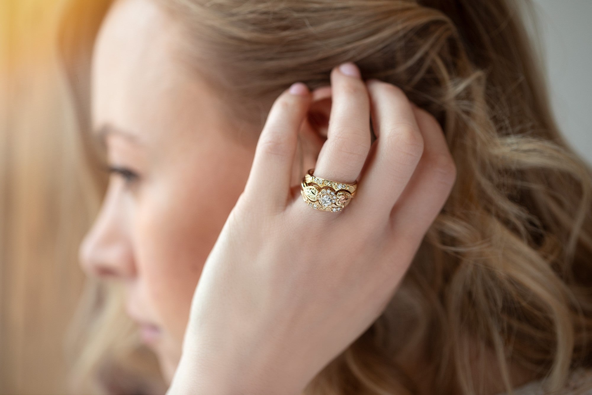 Black Hills Gold Ladies Halo Diamond Engagement Ring, 10K Shank with 1/3CT+1/6TWT Round Diamonds and (2) 12K Green and Rose Leaves
