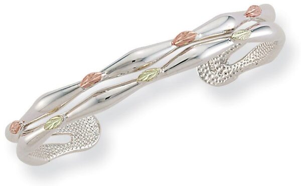 Black Hills Gold & Silver Ladies Stacked-look Cuff Bracelet, Split Silver Cuff with 12K Green and Rose Leaves