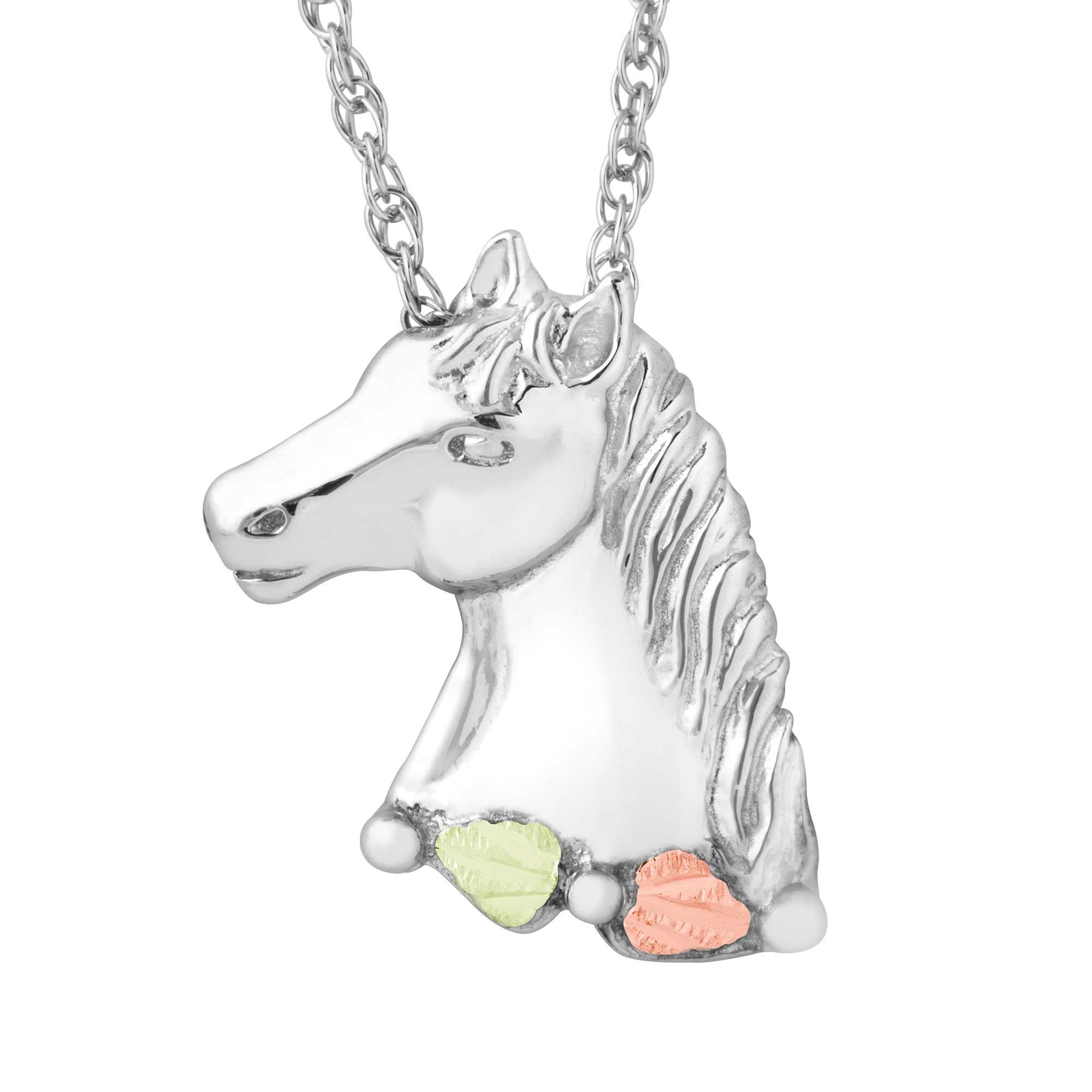 Black Hills Gold & Silver Ladies Horse Head Pendant, Silver Horse Head with (2) 12K Green and Rose Leaves, on 18″ Silver Rhodium-Plate Chain