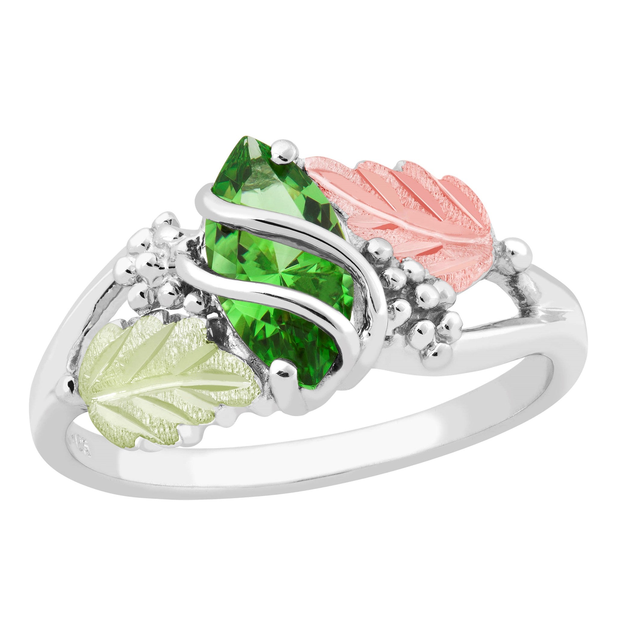 Black Hills Gold & Silver Ladies Birthstone Ring, Silver Ring with Grape Clusters, Caged 10x5MM Synthetic Marquise Emerald (May) and (2) 12K Green and Rose Leaves