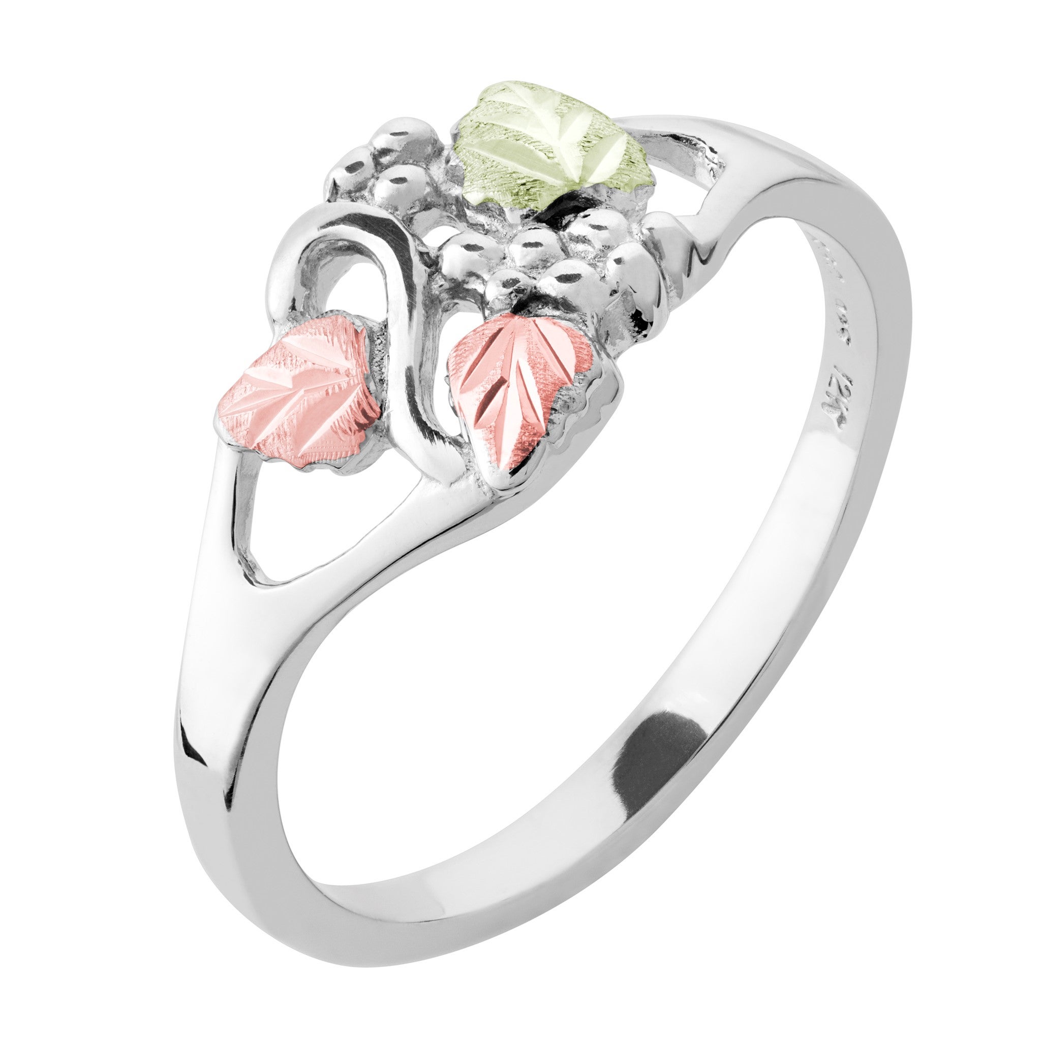 Black Hills Gold & Silver Ladies Freeform Ring, Silver Ring with Vine, Grape Clusters, and (3) 12K Green and Rose Leaves