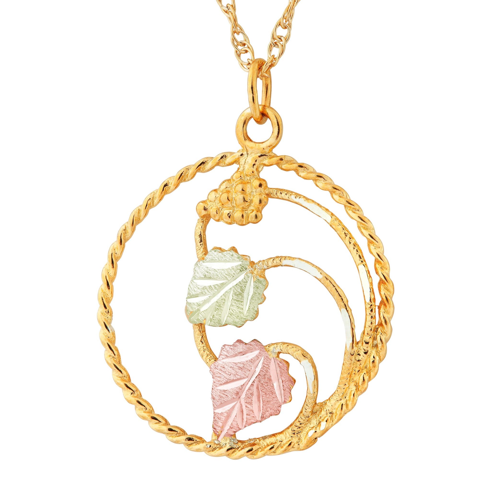 Black Hills Gold Classic Collection Circle Pendant, 10K Twisted Rope Circle with Grape Cluster, Vines, and (2) 12K Green and Rose Leaves inside, on 18″ GF Chain