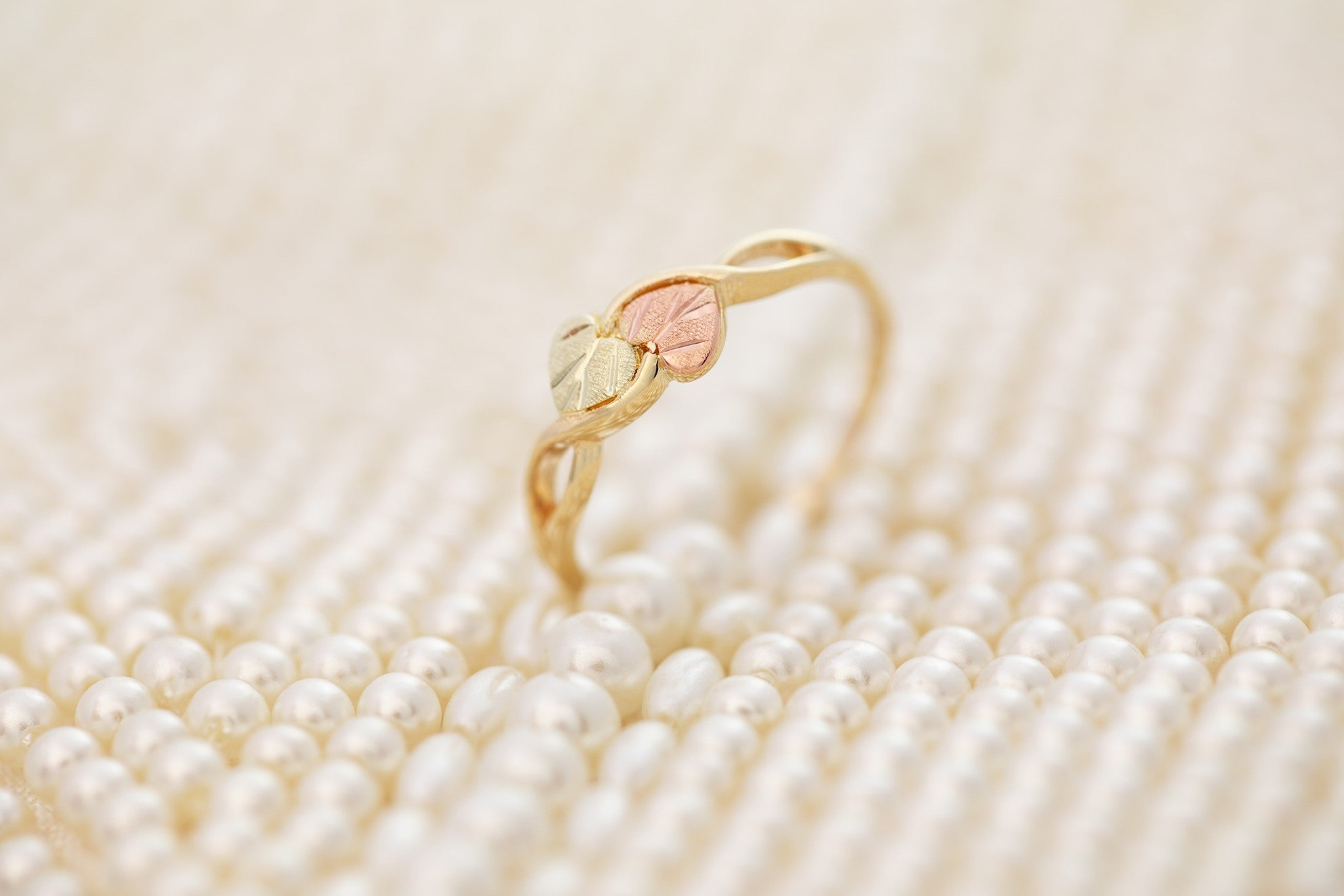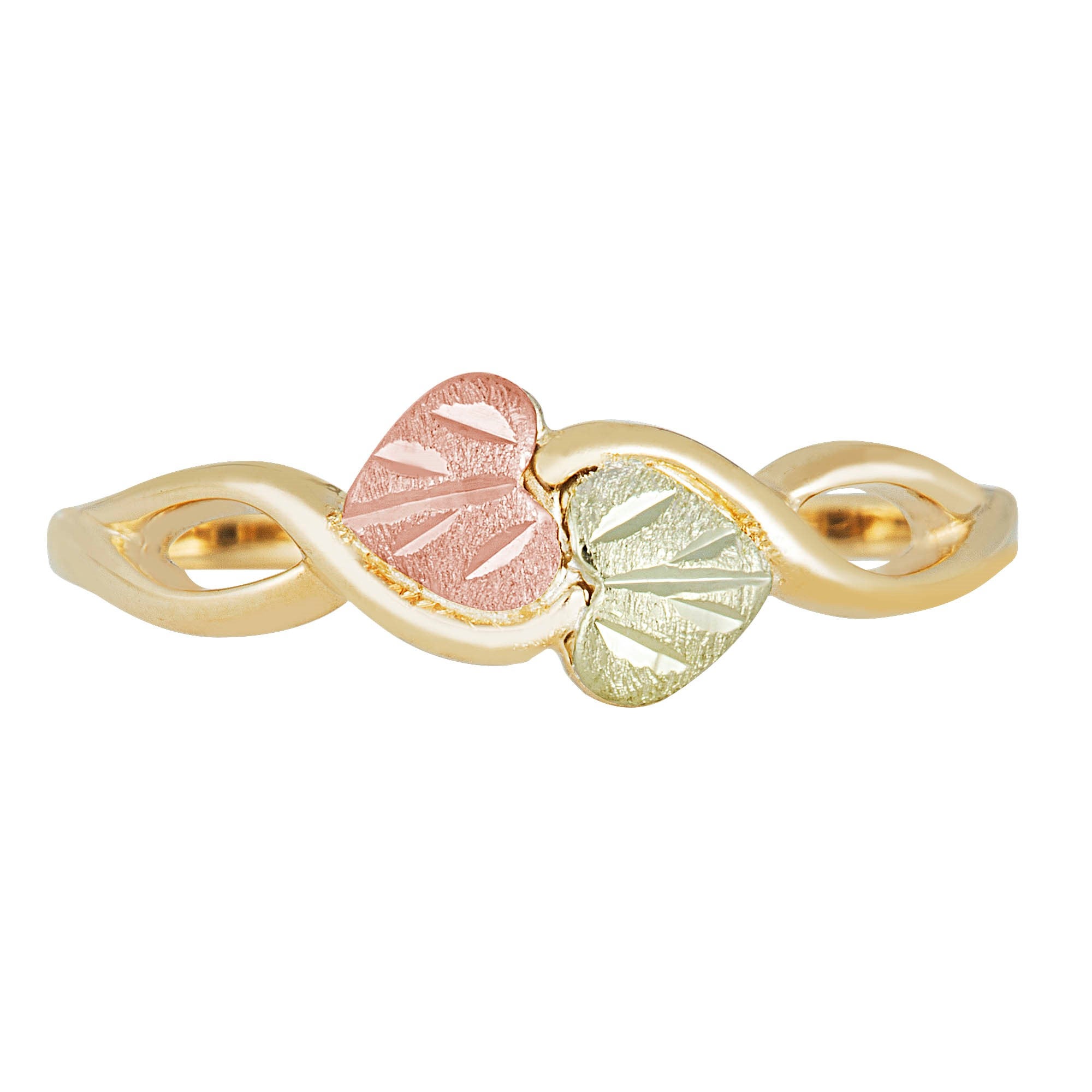 Black Hills Gold Ladies Ring, 10K Freeform Shank with (2) 12K Green and Rose Leaves