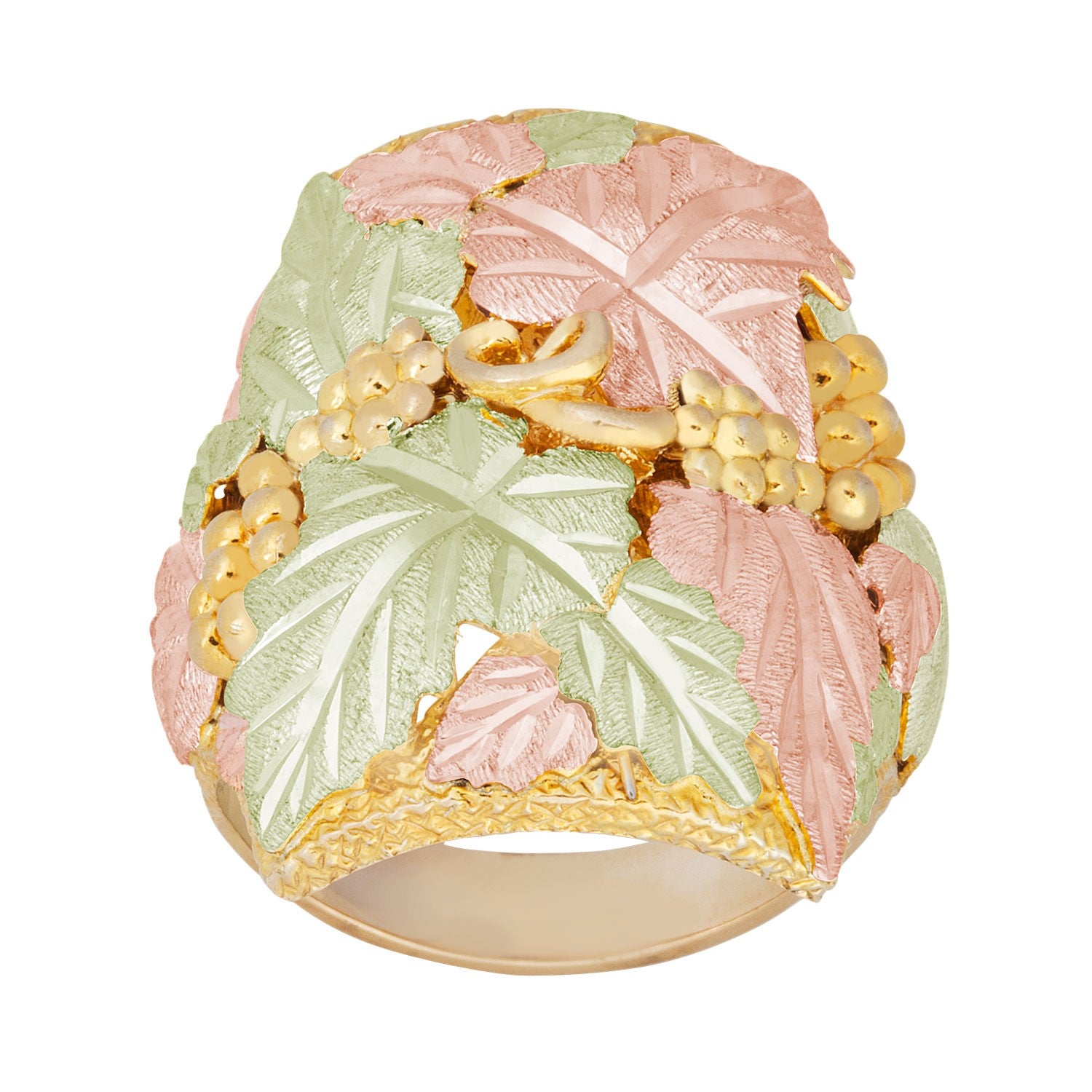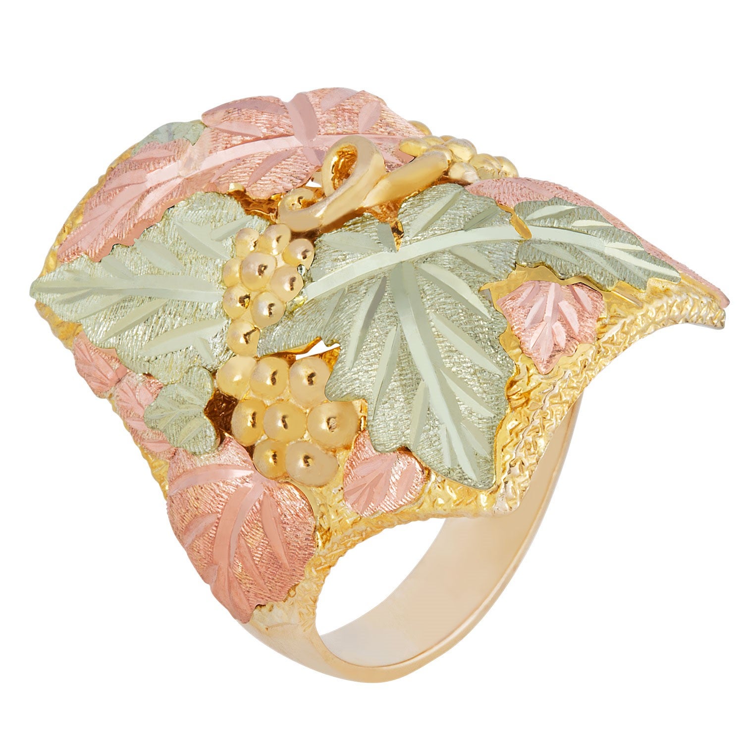 Black Hills Gold Men’s Ring, 10K Shank with Large Rectanglar Top covered with Grape Clusters and 12K Green and Rose Leaves, and down the sides