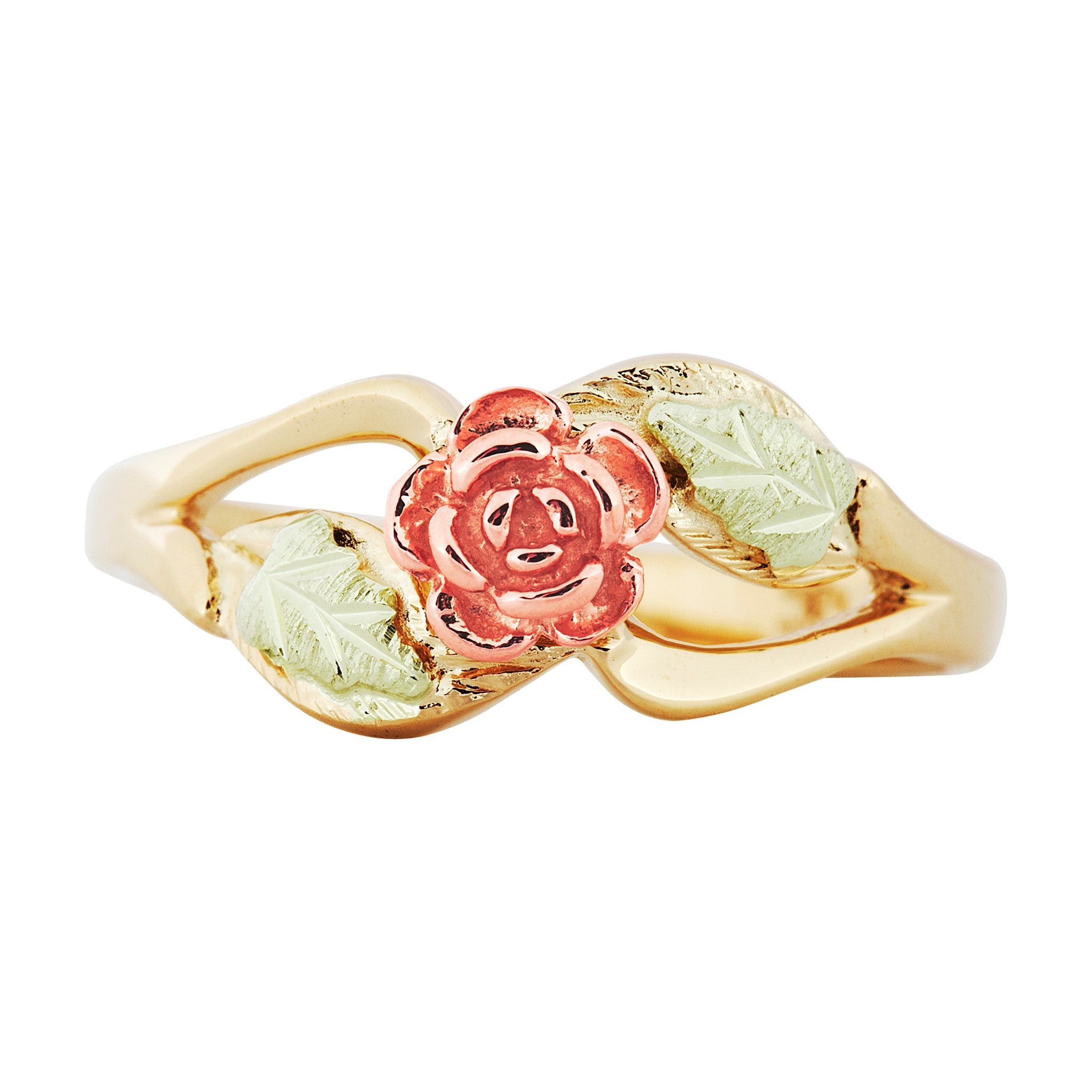 Black Hills Gold Ladies Ring, 10K Open Shank with Center Rose and (2) 12K Green Leaves