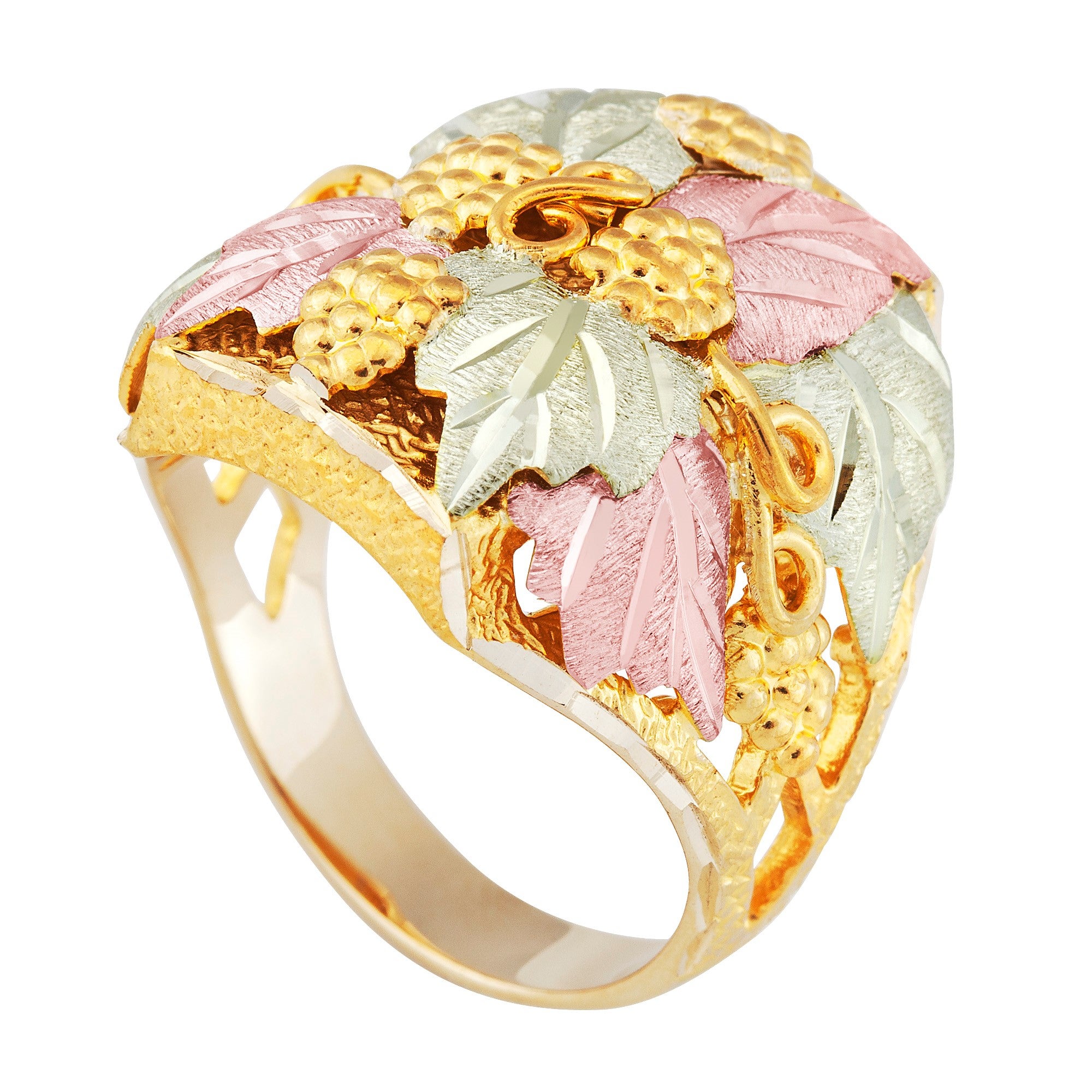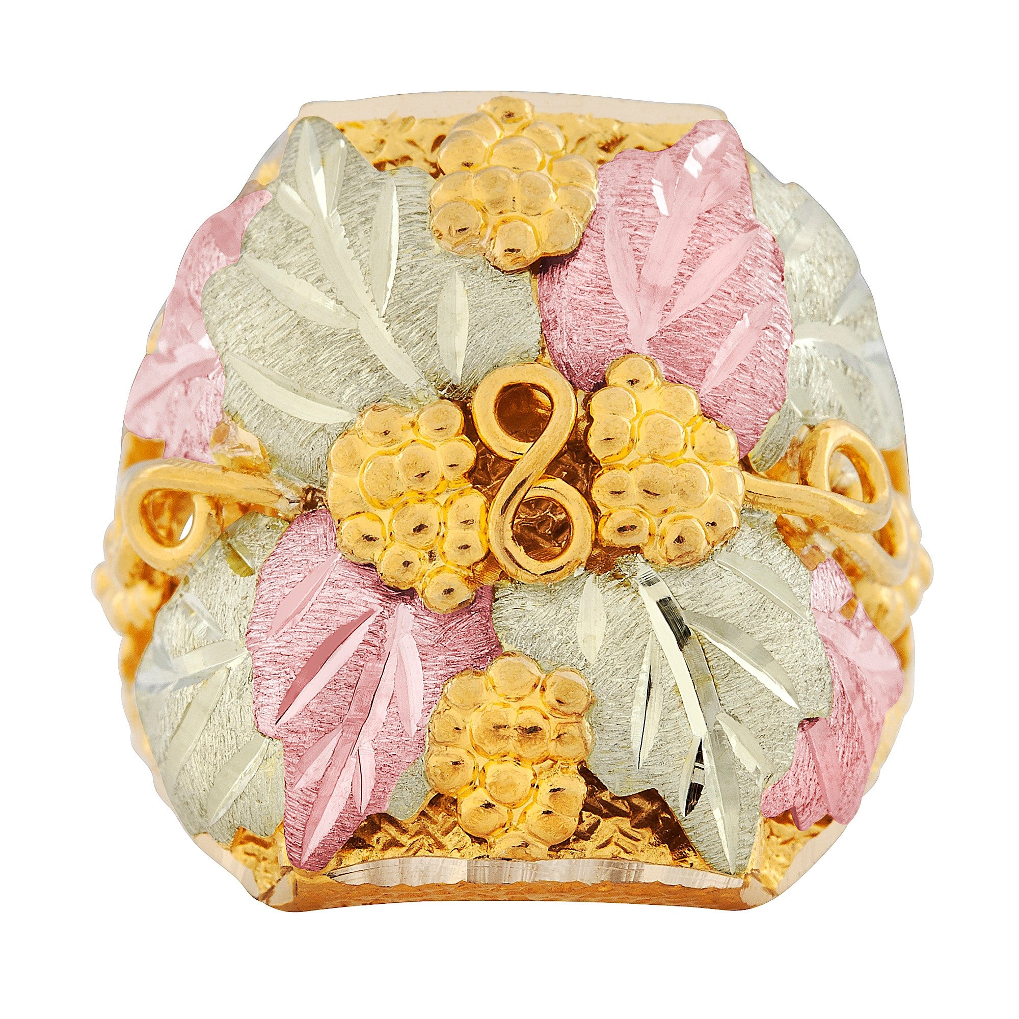 Black Hills Gold Men’s Ring, 10K Shank with Rectangular Top featuring Grape Clusters, Vines, and 12K Green and Rose Leaves on the top and going down the side
