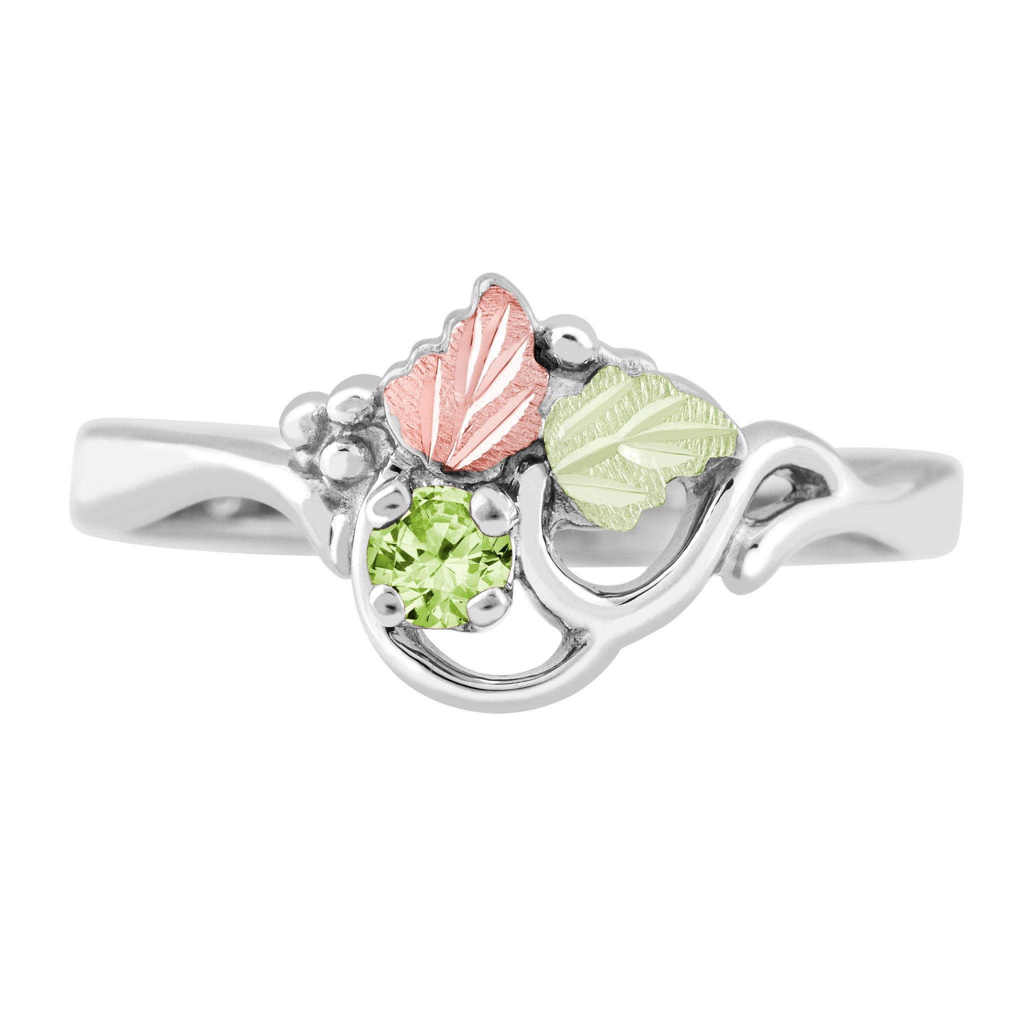 Black Hills Gold & Silver Ladies Birthstone Ring; Silver Freeform Ring with Grapes, 12K Green and Rose Leaves, and 3MM Synthetic Round Peridot (Aug)