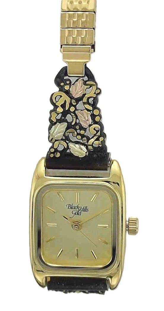 Oblong gold watch face with Black Hills Gold accented black powder coat alloy tip watchband G LLWB9285