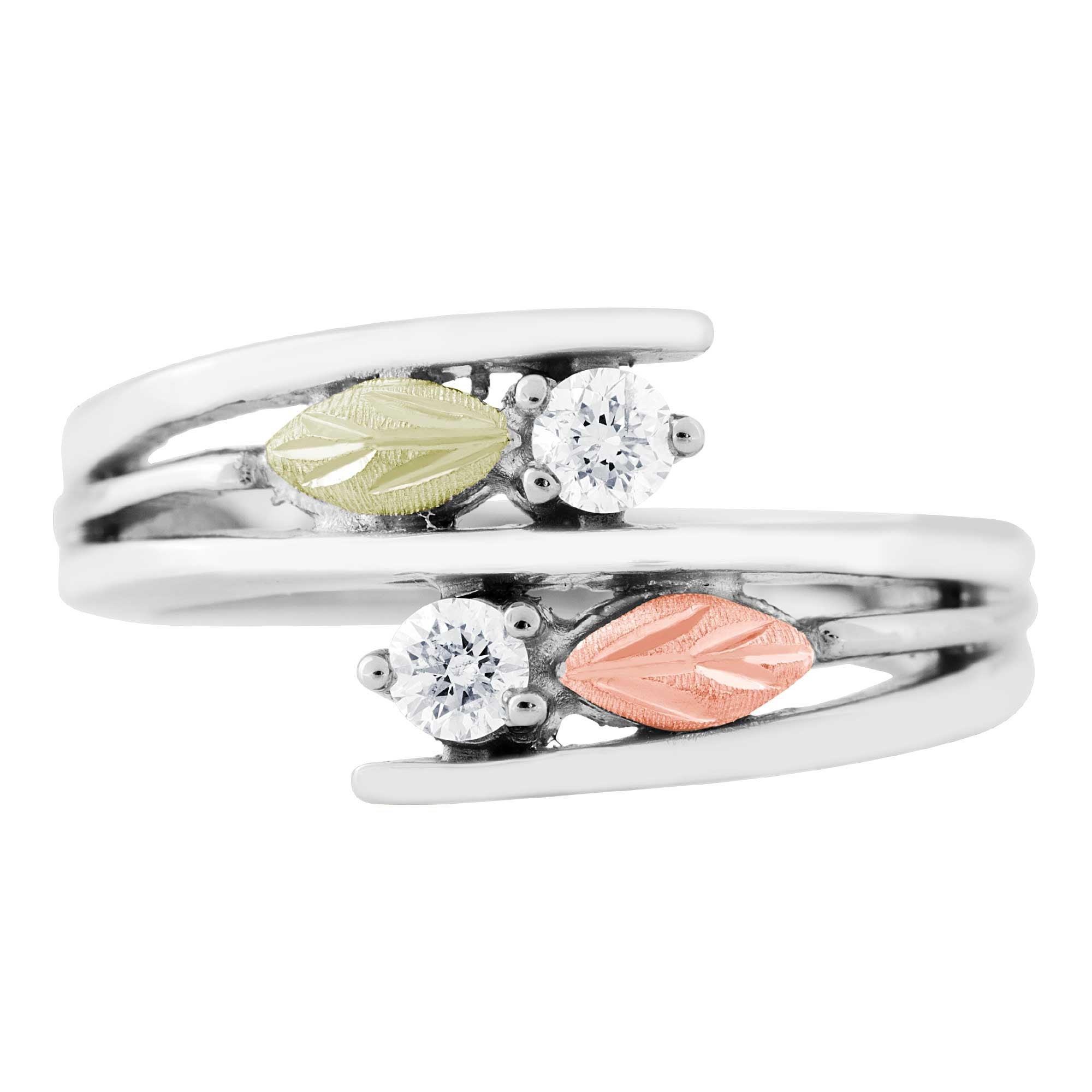 Black Hills Gold & Silver Ladies Diamond Ring; Silver Bypass Shank accented with .20TWT Round Diamonds and 12K Green and Rose Leaves