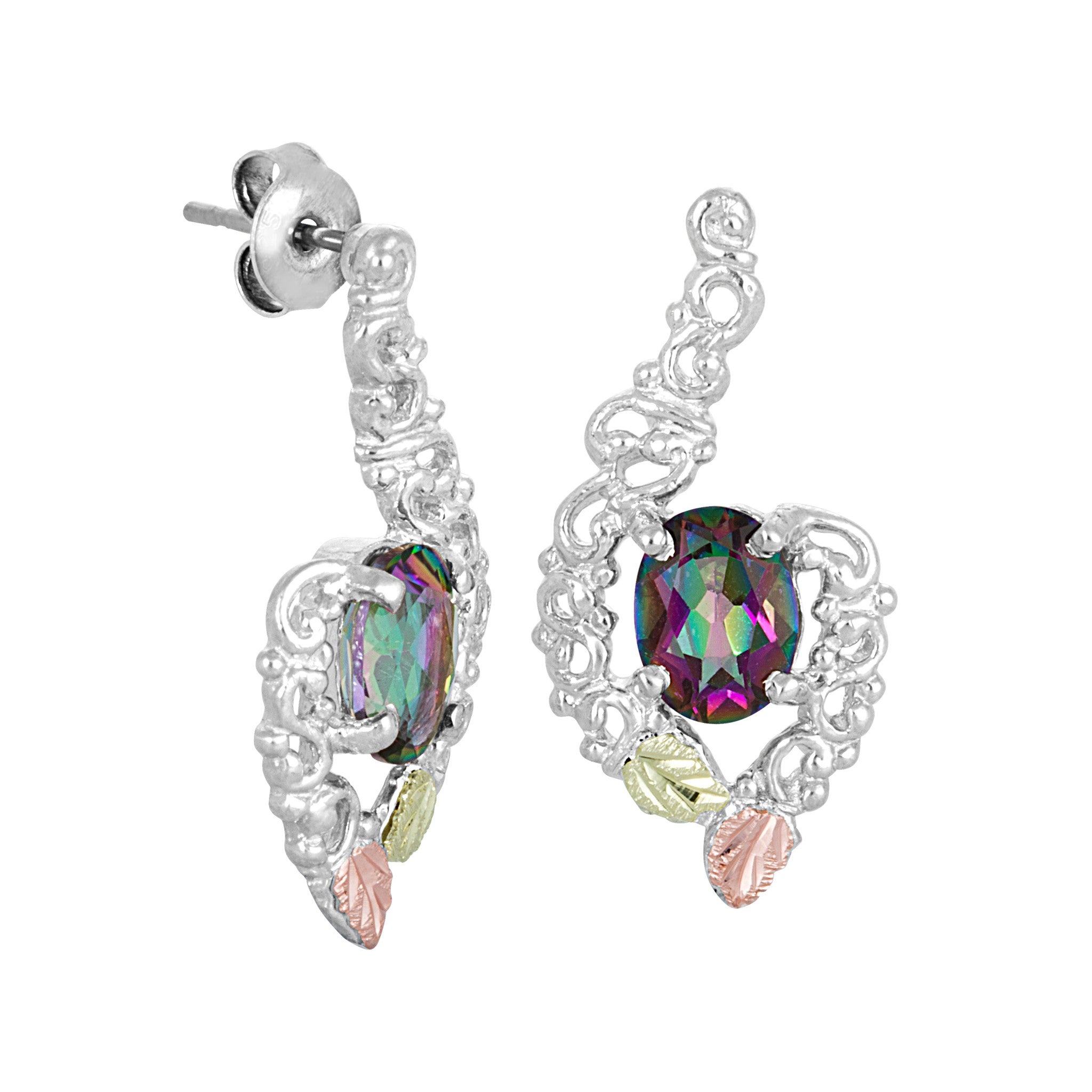 Black Hills Gold & Silver Mystic Fire Post Earrings; Ornate Freeform Silver Earrings with 8x6MM Genuine Oval Mystic Fire Topaz, and 12K Green and Rose Leaves