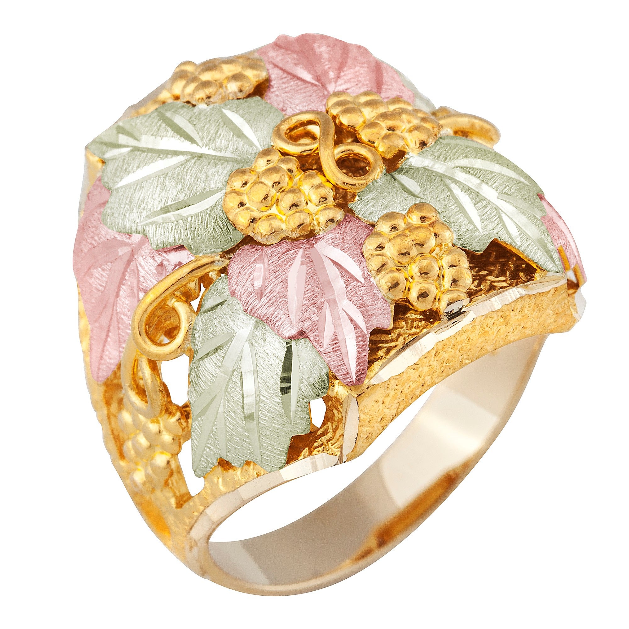 Black Hills Gold Men’s Ring, 10K Shank with Rectangular Top featuring Grape Clusters, Vines, and 12K Green and Rose Leaves on the top and going down the side