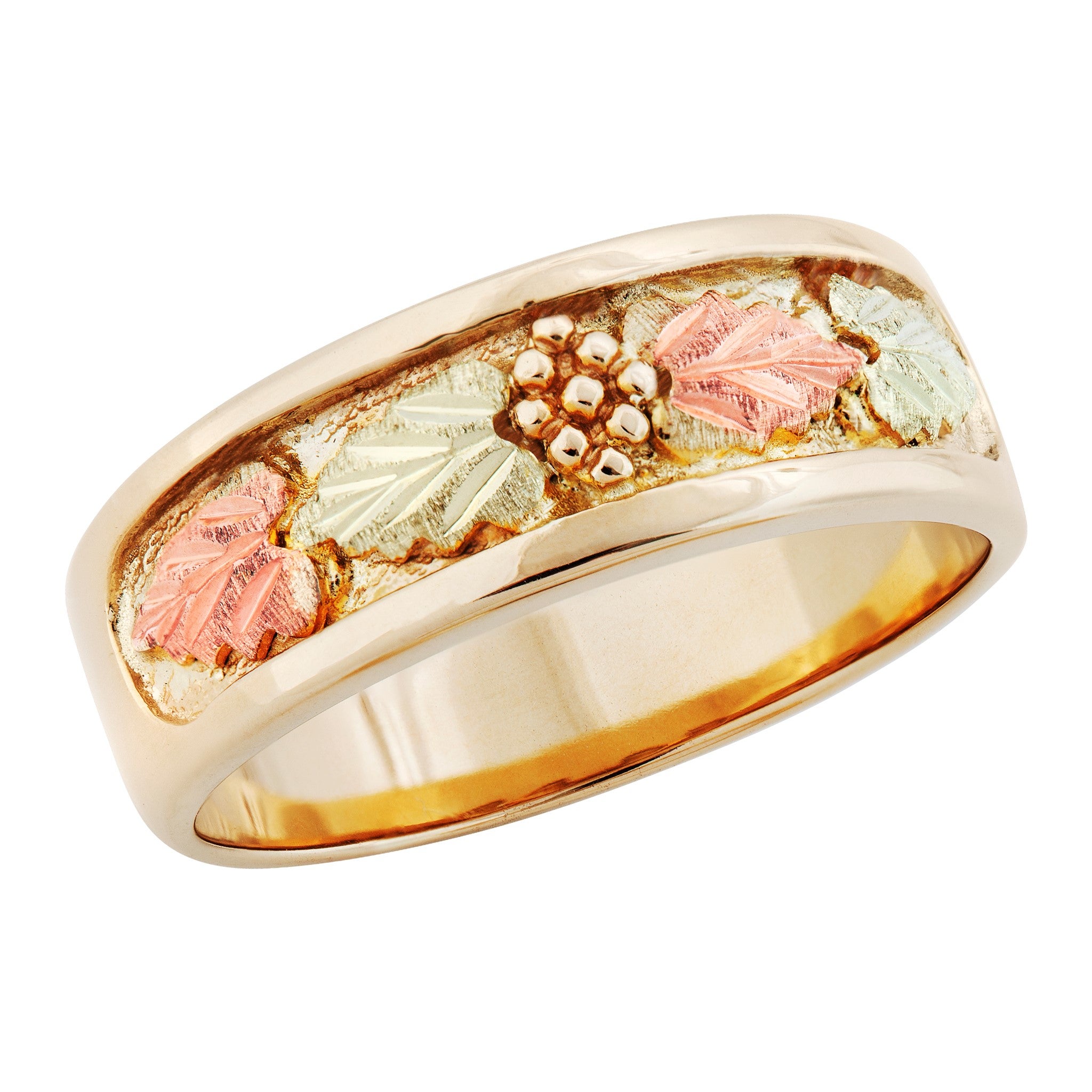 Black Hills Gold Men’s Wedding Band, 10K Straight Shank with recessed center containing a Grape Cluster and (4) 12K Green and Rose Leaves