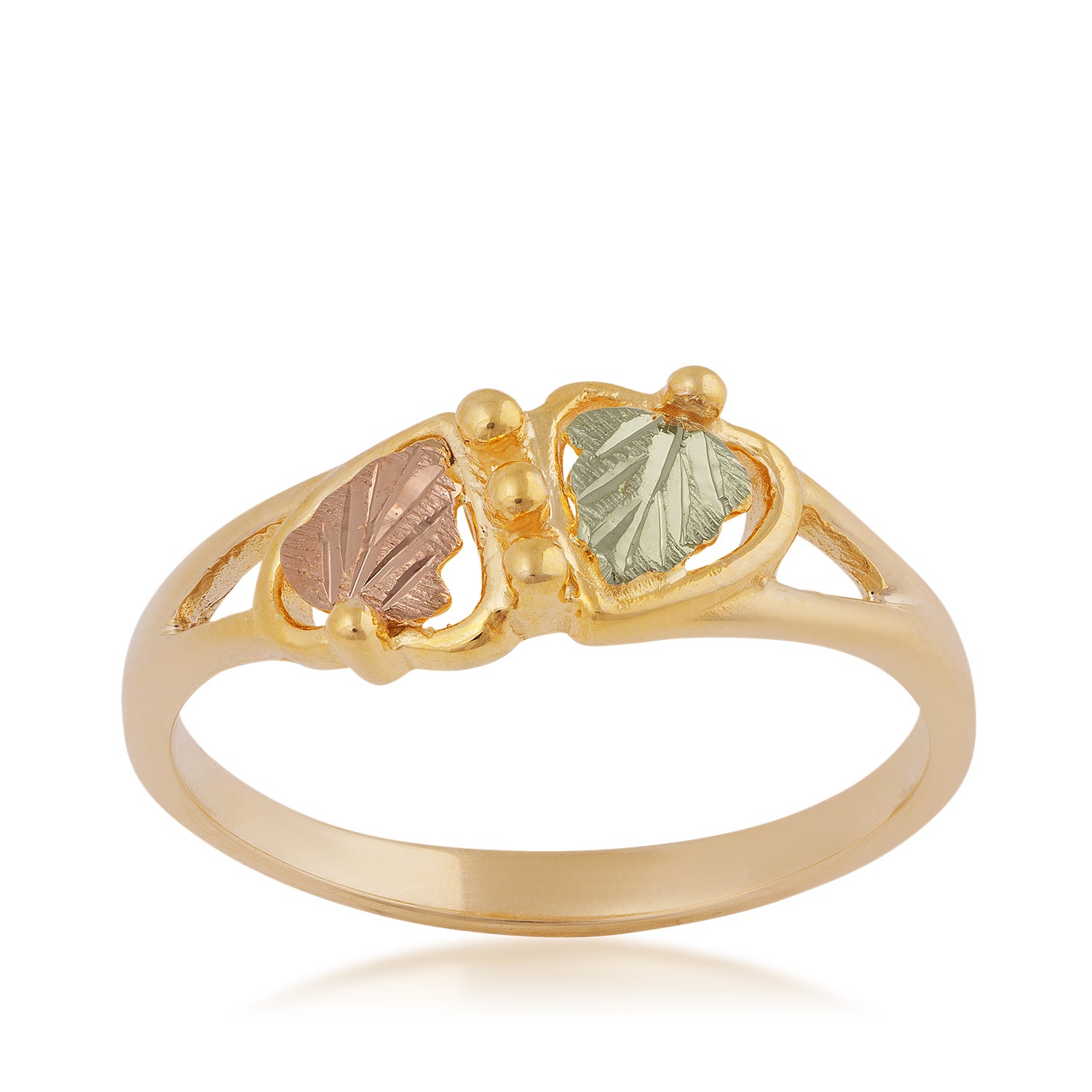 Black Hills Gold 12K yellow gold double hearts surrounded by vinework & grapes. The center of each heart is accented with 12K red & green gold leaves.