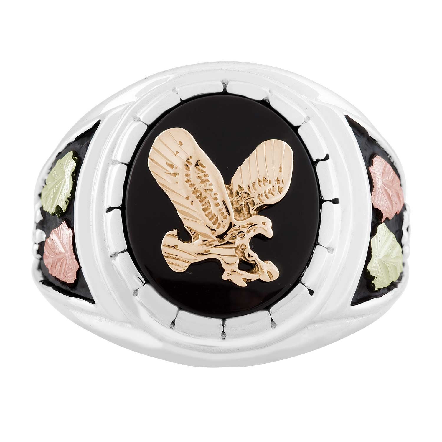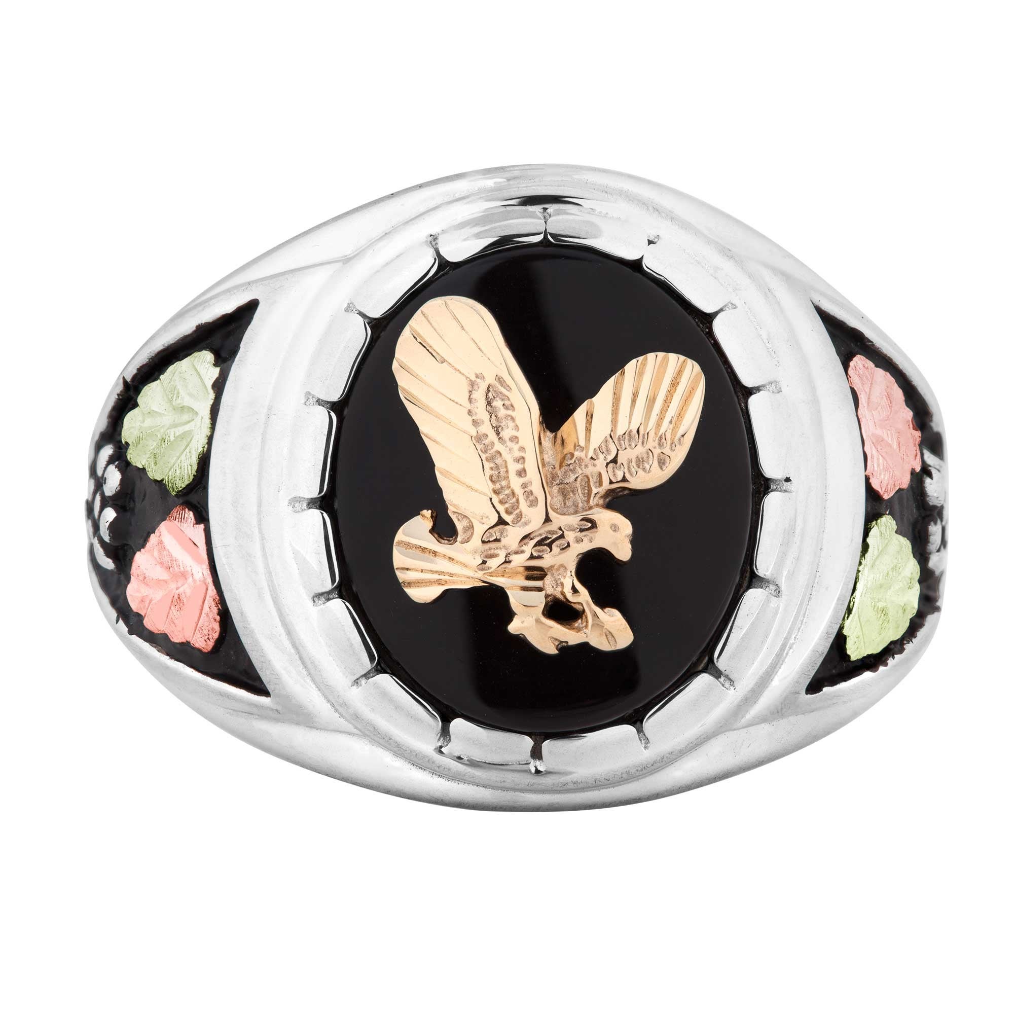 This brilliant mens ring is expertly-crafted, primarily in sterling silver, with black (powder coat) antiquing to accent our Signature 12K pink (2) & green (2) Black Hills Gold leaves, and a beautifully polished onyx stone set behind a 10K Black Hills yellow-gold eagle.