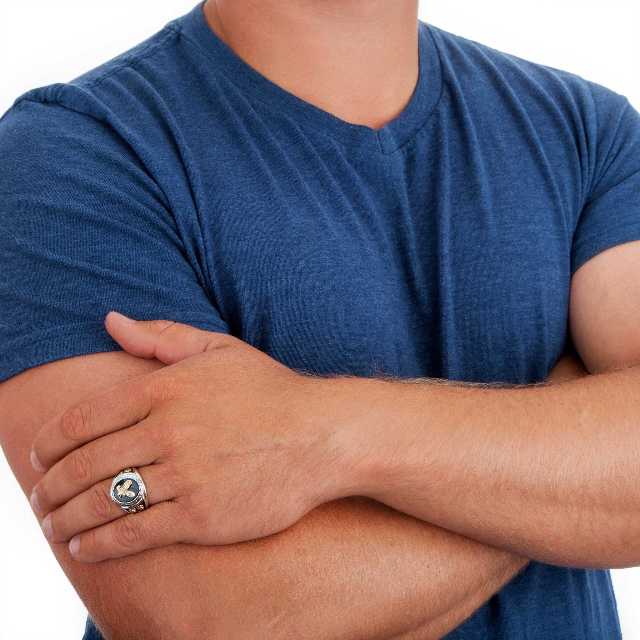 This brilliant mens ring is expertly-crafted, primarily in sterling silver, with black (powder coat) antiquing to accent our Signature 12K pink (2) & green (2) Black Hills Gold leaves, and a beautifully polished onyx stone set behind a 10K Black Hills yellow-gold eagle.