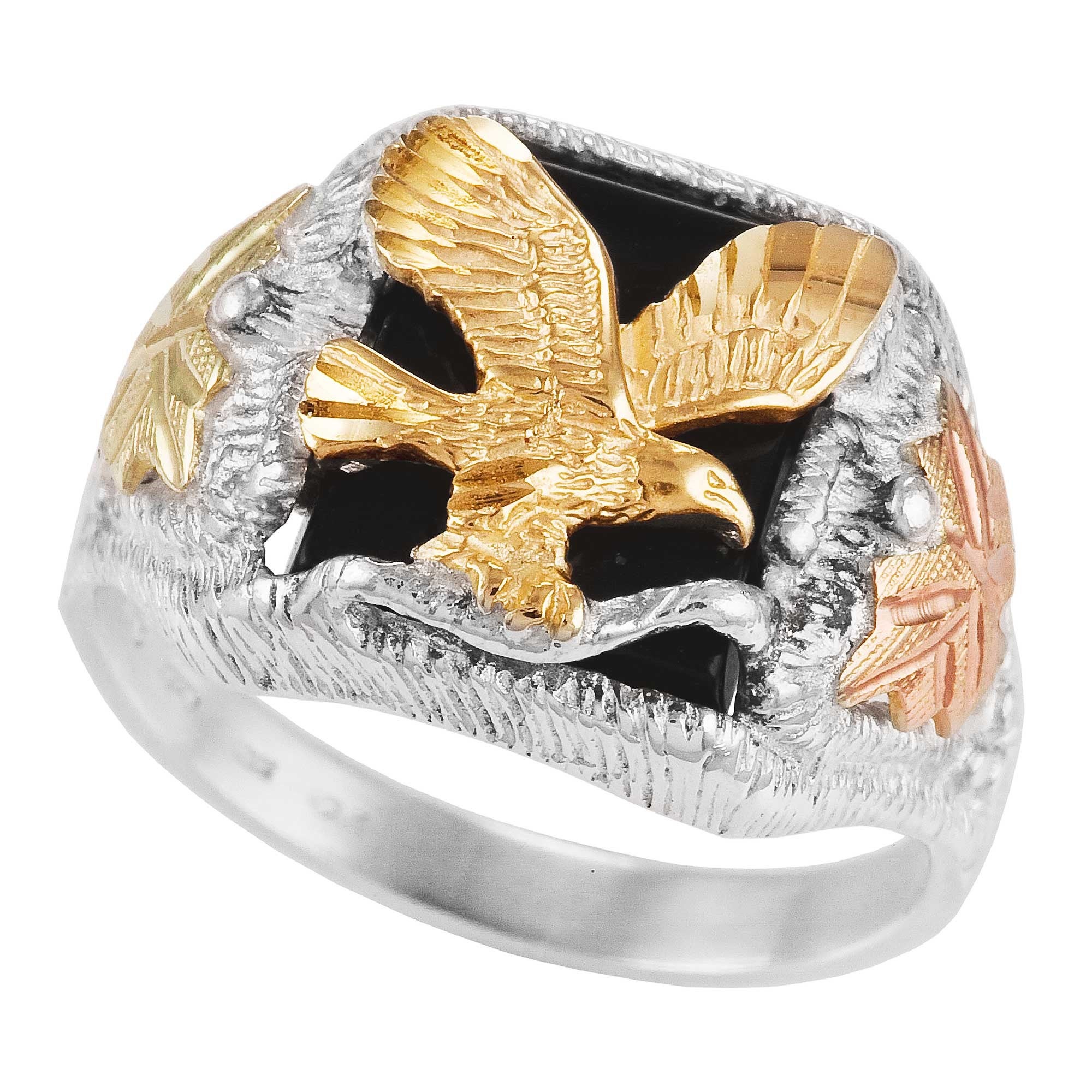 Sure To Start A Conversation, This Sterling Silver Bald Eagle Ring Beautifully Accents Our Signature Pink & Green 12K Black Hills Gold Leaves (2) and genuine black onyx stone behind the solid 10K gold soaring eagle.