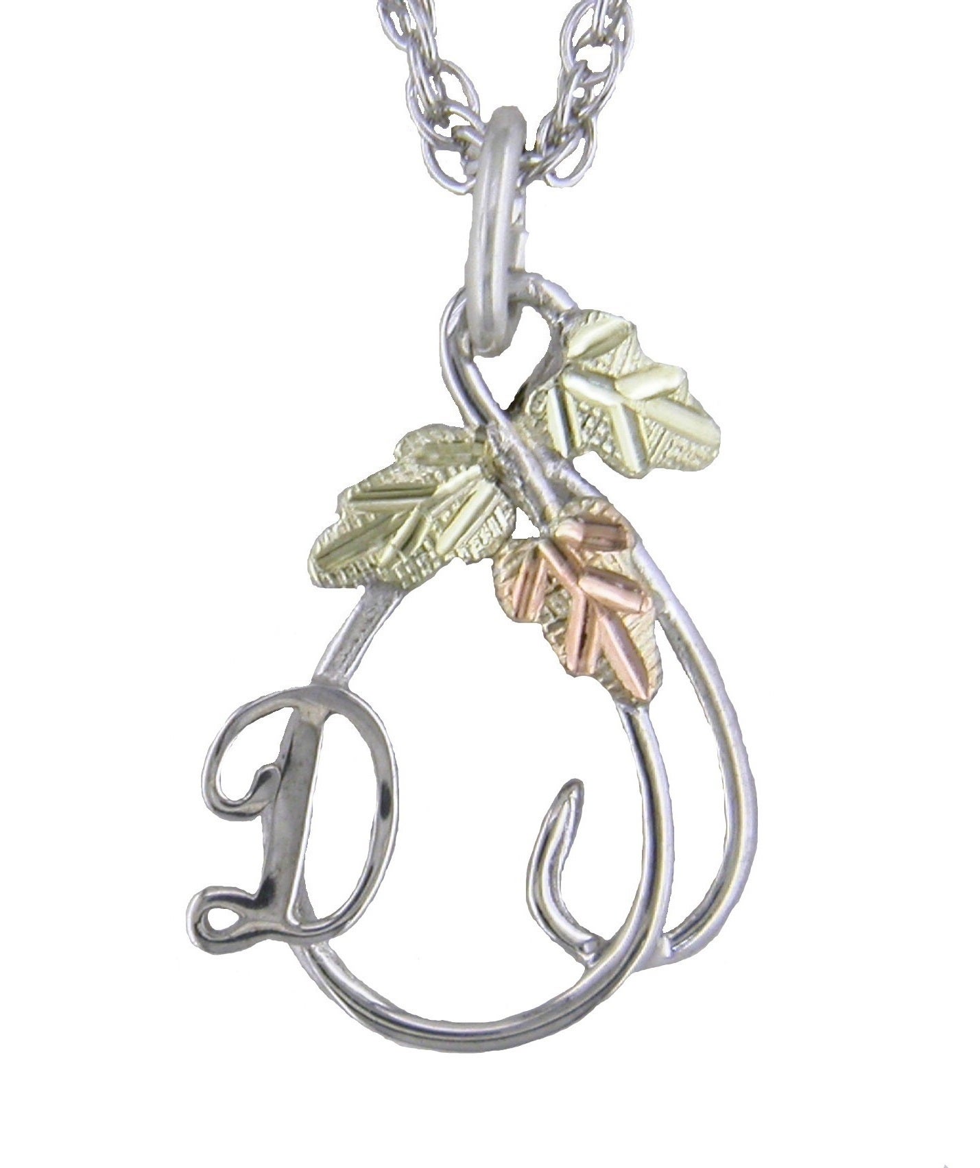 *INITIAL PENDANT* This sterling silver “D” pendant is expertly-cast in sterling silver with the body of the pendant being a pear/teardrop shape, proudly showcasing the letter “D” on left side near the bottom, and 3 of our signature 12K Black Hills Gold leaves in the colors pink (1) & green (2).