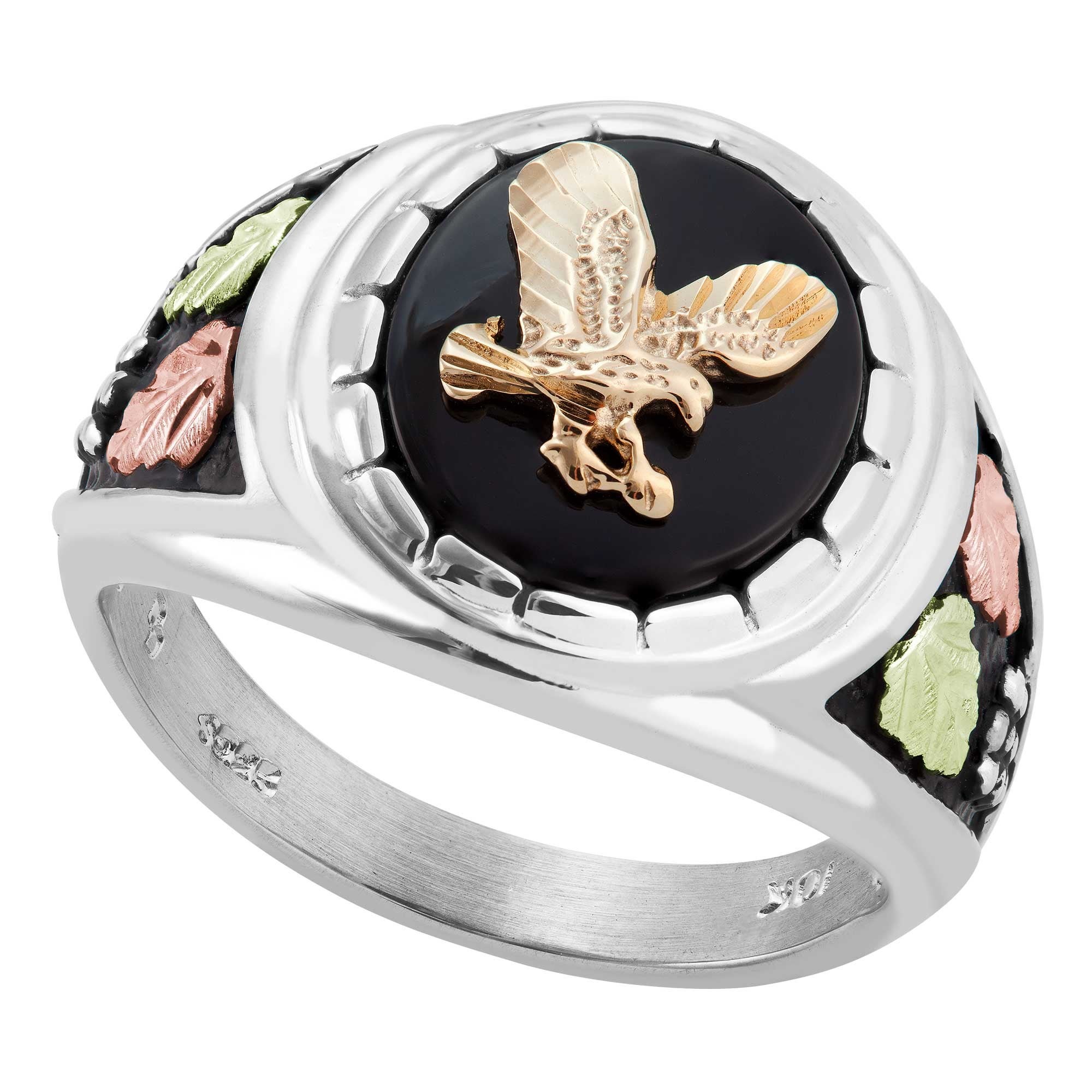 This brilliant mens ring is expertly-crafted, primarily in sterling silver, with black (powder coat) antiquing to accent our Signature 12K pink (2) & green (2) Black Hills Gold leaves, and a beautifully polished onyx stone set behind a 10K Black Hills yellow-gold eagle.