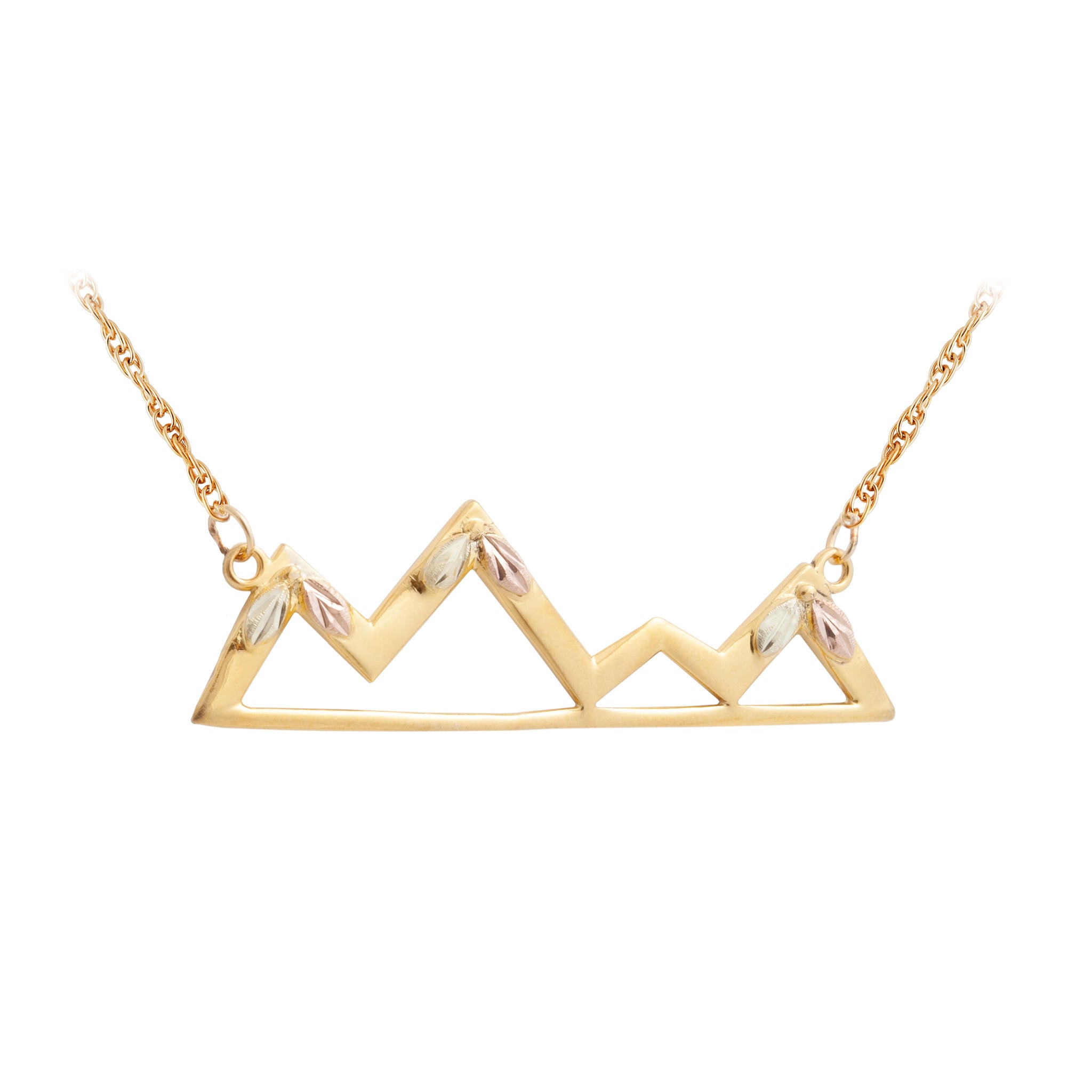 Carry A Little Piece Of The Mountains With You With This Mountain Range Pendant! This Pendant Features Mountain Peaks Accented With Our Signature 12K Black Hills Leaves In The Colors Pink & Green (6); This Pendant Comes On A Complimentary 18″ Festoon Hamilton Chain.