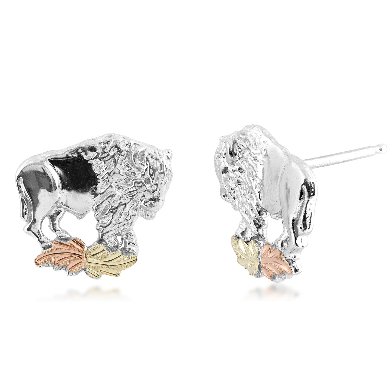 Black Hills Gold & Silver Buffalo post earrings. Sterling silver rhodium plated buffalo’s are adorned with 12K pink & green gold leaves.