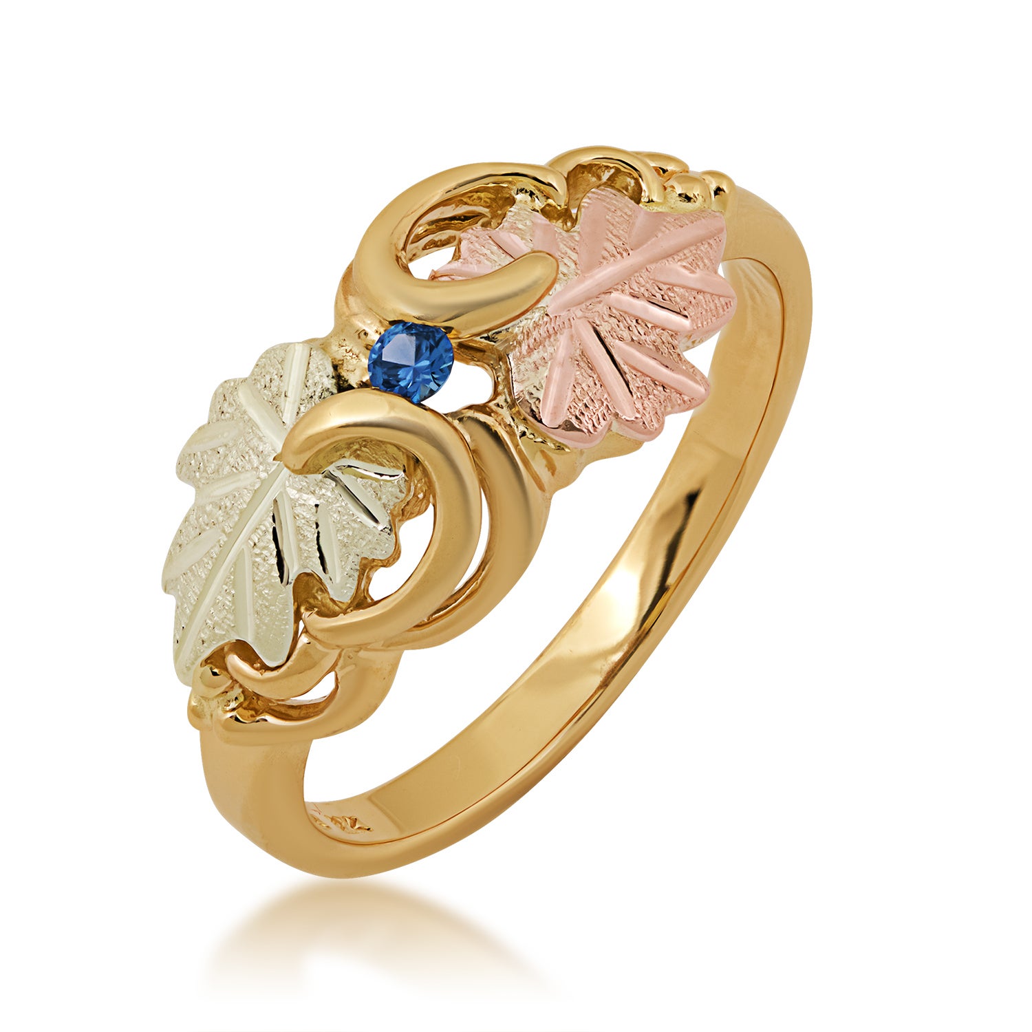 PRETTY 10K YELLOW GOLD LADIES RING FEATURING A .03CT YOGO SAPPHIRE AND COMPLIMENTED WITH 12K PINK AND GREEN LEAF ON EACH SIDE. Yogo Sapphires – BORN IN MONTANA! Yogo Sapphires – BORN IN MONTANA! Yogo Sapphires come from the world’s largest underground primary deposit of premium high quality, 100%natural sapphires. Unlike most sapphires on the market today, Yogos are not heat treated.